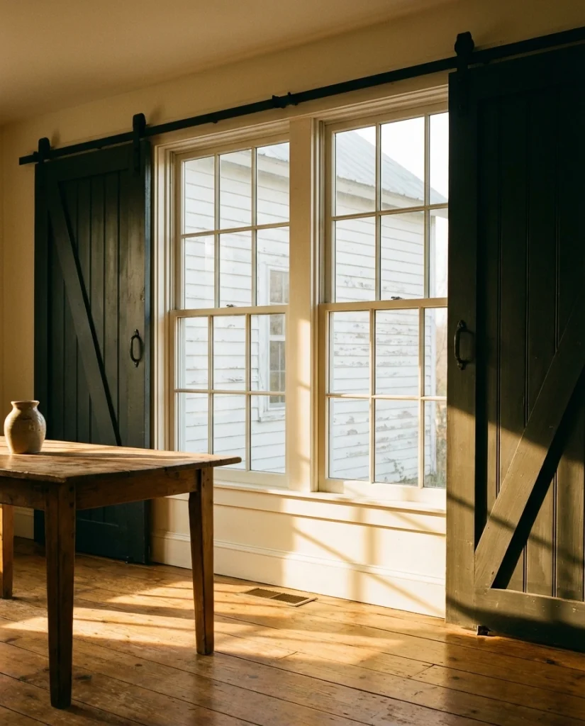 A common mistake involves installing these doors purely decoratively, mounted directly against the wall where they cannot actually slide, which savvy observers recognize as inauthentic and frustrates homeowners who later wish they’d invested in functional hardware. Real installations require standoff brackets that position the track 4 to 6 inches from the wall surface, allowing doors to slide freely while creating shadow depth that enhances the three-dimensional quality. Complete systems including doors, tracks, and installation labor typically run $1,800 to $3,500 per opening depending on size and material, with operable versions adding roughly $600 to $1,000 compared to fixed decorative alternatives—money well spent for homeowners in hurricane zones or those who value security and light control.