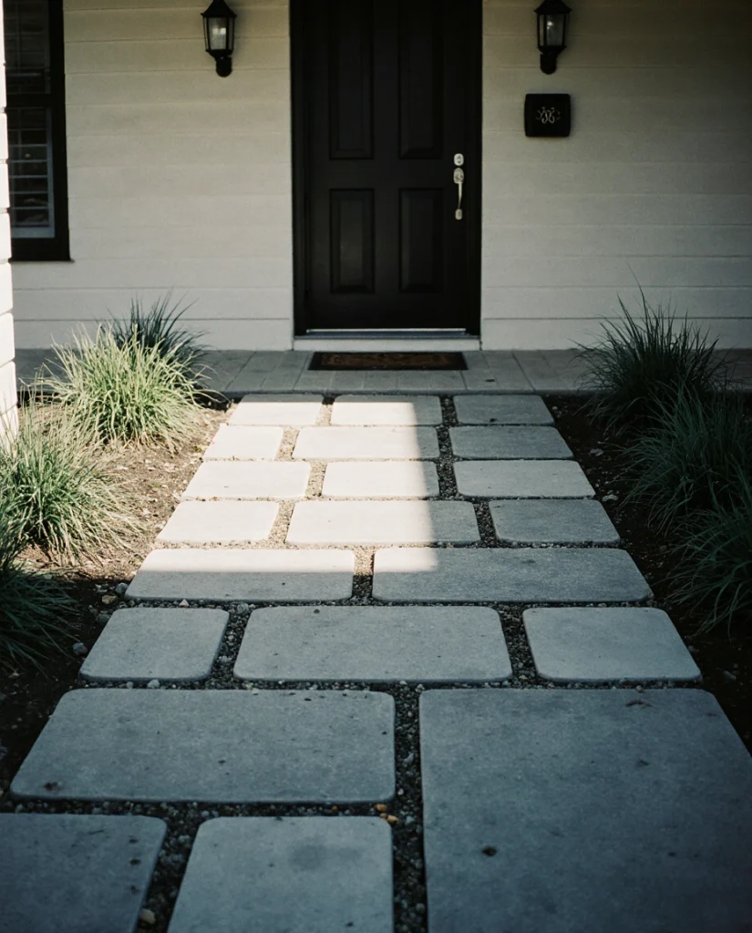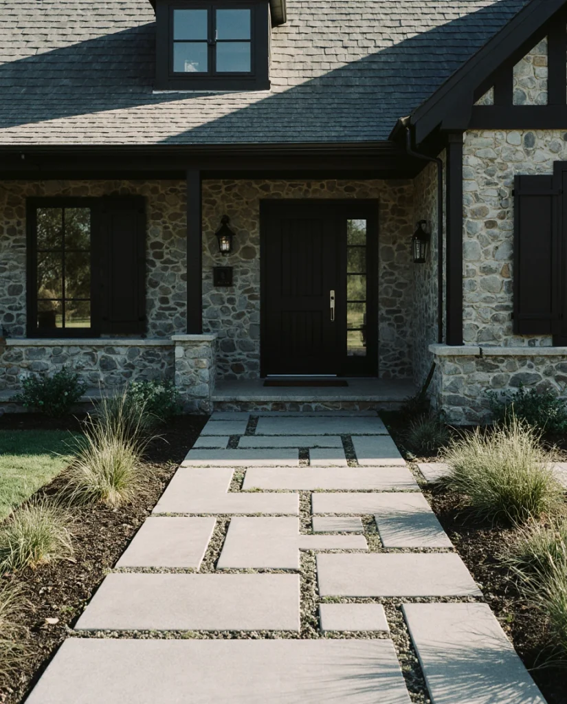 Moving away from traditional brick or paver walks, concrete and bluestone paths bring contemporary material honesty to farmhouse exteriors while providing durable, low-maintenance approaches to the front entry. Smooth-troweled concrete in natural gray or subtle integral colors creates a clean, minimal gesture that doesn’t compete with the architecture, while bluestone in irregular or geometric patterns adds natural texture and regional character, particularly in northeastern states where this material has been quarried for centuries. Both materials handle freeze-thaw cycles better than brick when properly installed, making them practical choices for northern climates where heaving and cracking plague less suitable decor elements.