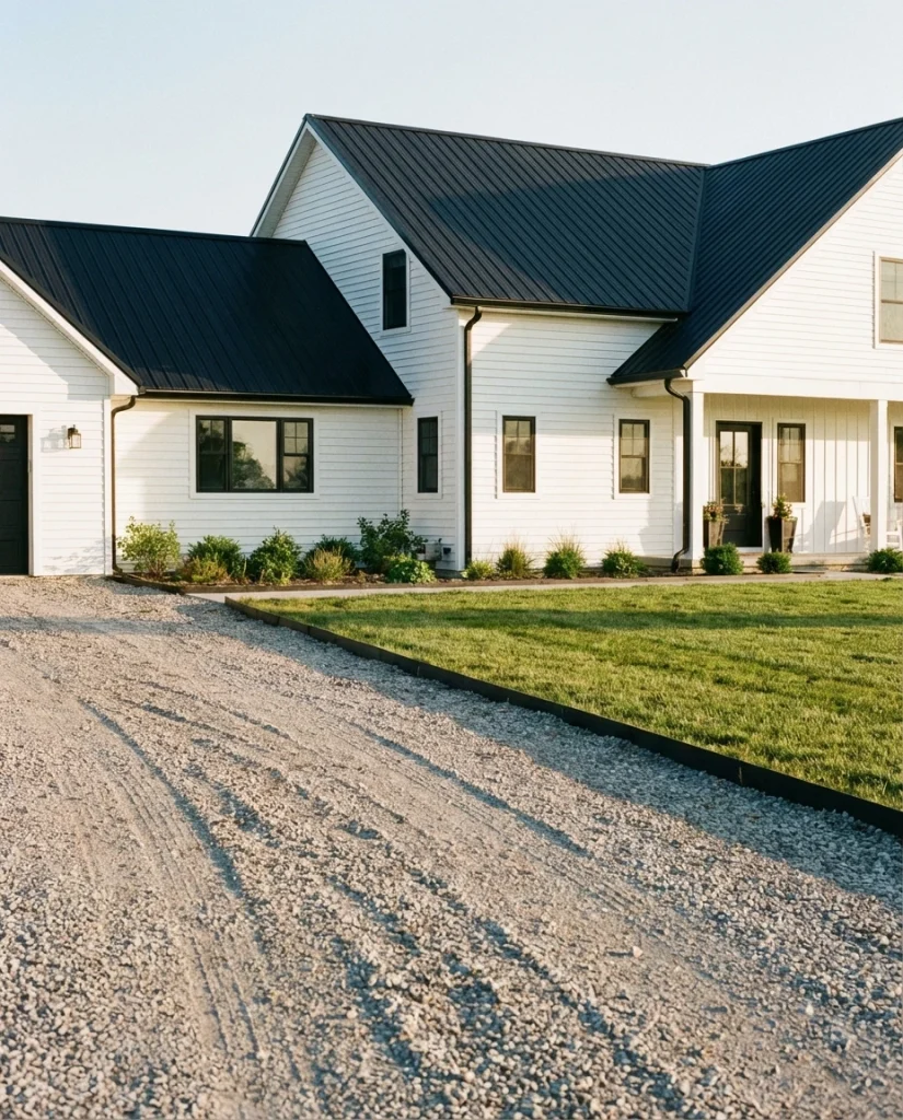 Crushed stone or pea gravel driveways edged with steel, concrete, or wood borders bring informal character to farmhouse properties while managing costs and stormwater more sustainably than paved alternatives. The material choice communicates rural sensibility and working-landscape authenticity, particularly appealing for properties on larger lots where asphalt or concrete expenses would run into tens of thousands of dollars. Proper installation with geotextile fabric beneath prevents weed growth and stone migration, while the edging material contains the gravel and creates crisp lines that maintain the modern farmhouse aesthetic’s emphasis on intentional, ordered geometry even when using casual materials.