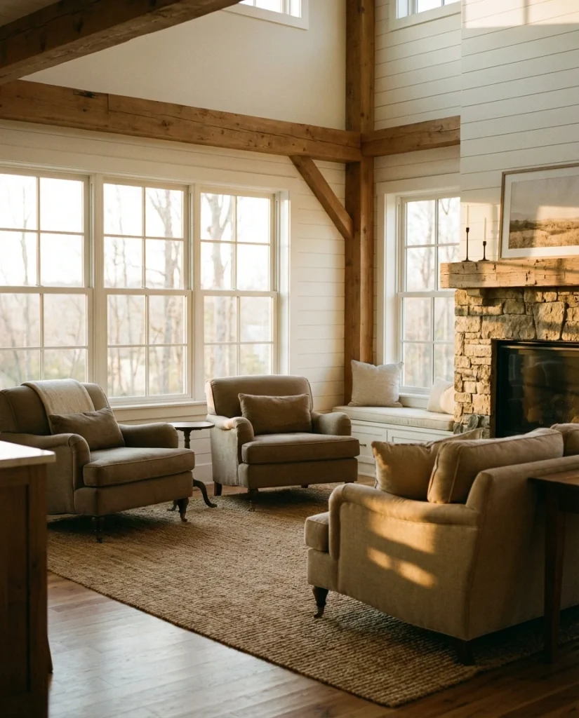 Moving away from steep farmhouse roof pitches, many 2026 designs embrace lower slopes around 4:12 or 5:12 that feel more horizontal and grounded, particularly when paired with deep overhangs extending 24 to 36 inches beyond the wall plane. This geometry provides excellent sun shading for south-facing windows in summer while allowing winter sun penetration when the solar angle drops, a passive design strategy that reduces energy consumption without mechanical intervention. The lower pitch also reduces material costs and wind loading in storm-prone regions, making this both an aesthetic and practical evolution of the modern farmhouse form that responds to contemporary building science and climate considerations.
