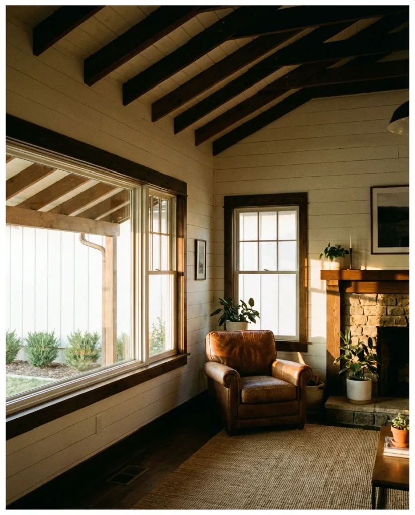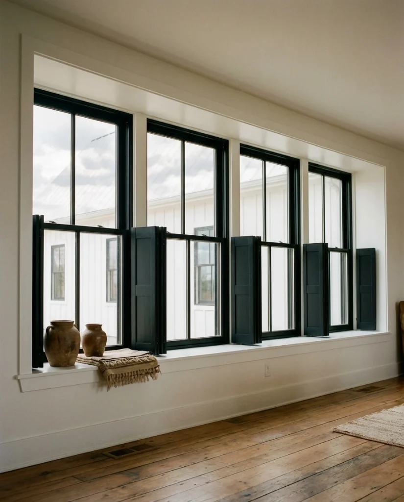 Generous window sizing with bold black aluminum or steel frames transforms modern farmhouse exteriors from quaint to architecturally significant, flooding interiors with natural light while creating dramatic façade geometry. The current trend favors groupings of three to five windows rather than single punched openings, establishing horizontal bands that emphasize the home’s connection to its landscape and bring a gallery-like quality to small space living areas. Black frames provide the crispest possible edge definition, reading almost like graphic lines drawn across white or light-colored siding, a contrast that photographs exceptionally well and maintains visual interest across all seasons and lighting conditions.
