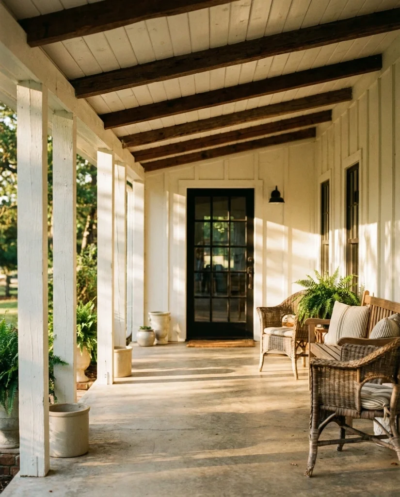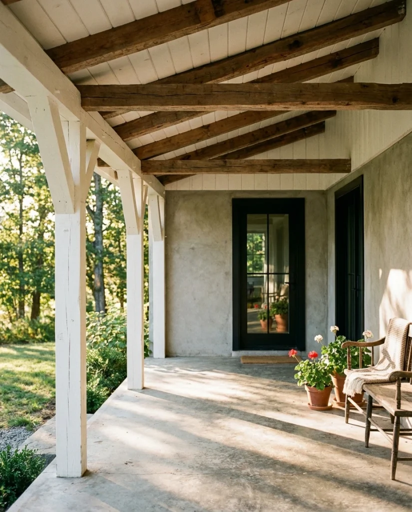 The covered front porch remains central to modern farmhouse exterior identity, but 2026 interpretations emphasize structural honesty through exposed rafter tails, natural wood posts, and open ceiling designs that reveal the building’s bones. These elements reference agricultural building traditions where structural efficiency and material economy created unintentional beauty, a quality that contemporary designers now recreate deliberately using engineered lumber sized for visual impact rather than pure structural necessity. The layout typically extends six to eight feet from the home’s face, providing genuine weather protection while creating a transitional zone between public street and private interior that encourages social interaction with neighbors and passersby.