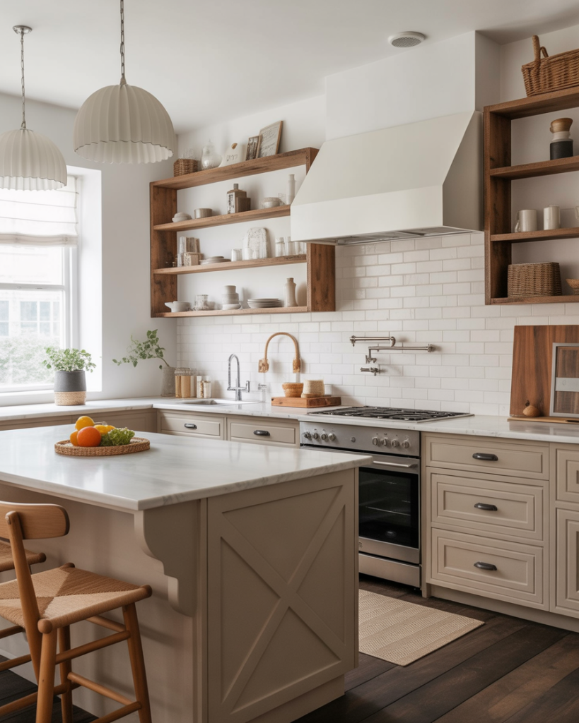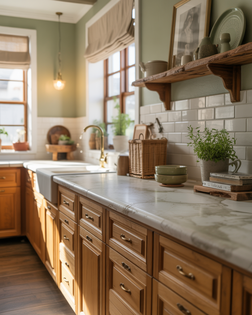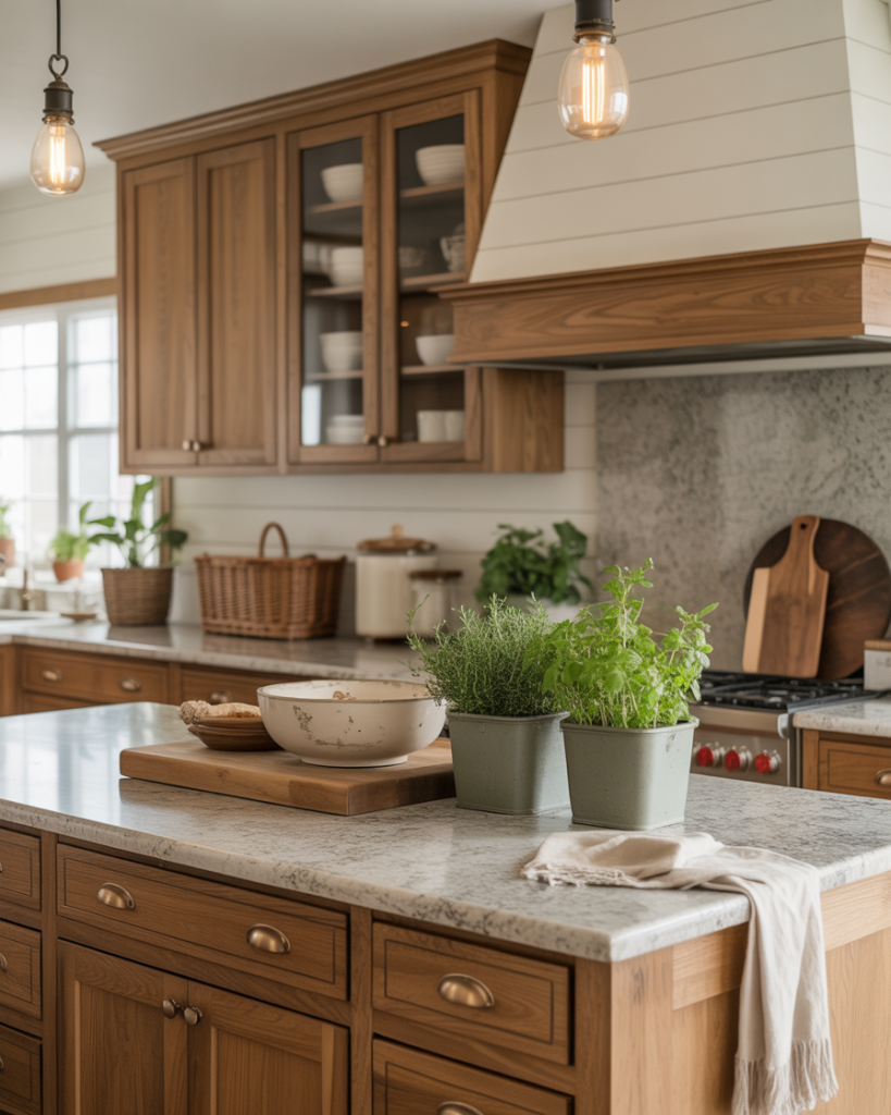 Using earthy paint colors, muted green tones, and natural wood cabinets creates a grounded base for a 2026 farmhouse kitchen. Stone countertops, vintage pulls, and soft white walls keep things timeless without feeling staged. This idea fits homes that want warmth without mess, the kind of space that feels lived in but still impresses guests.