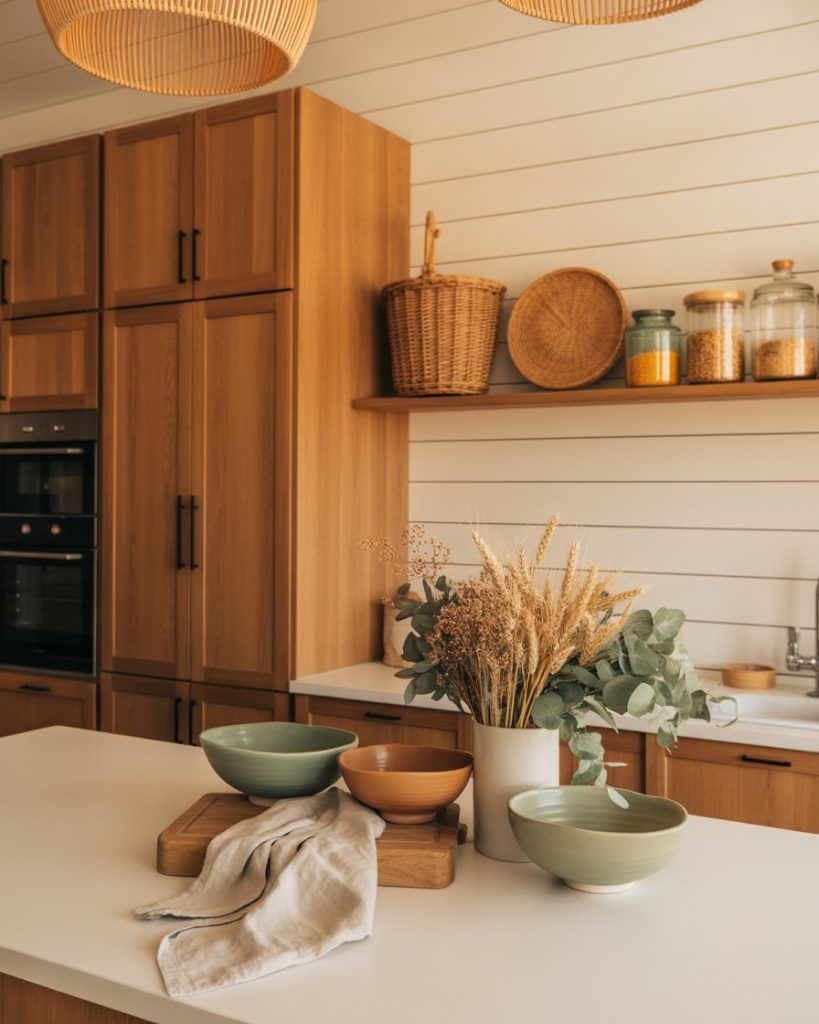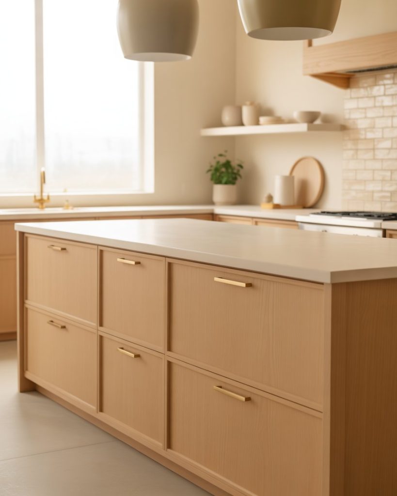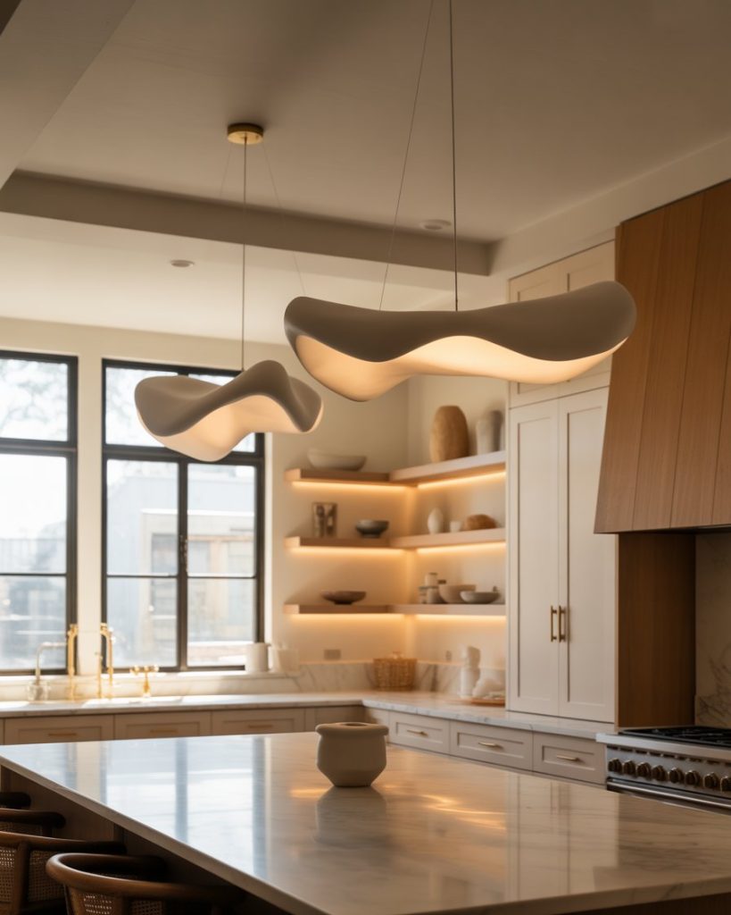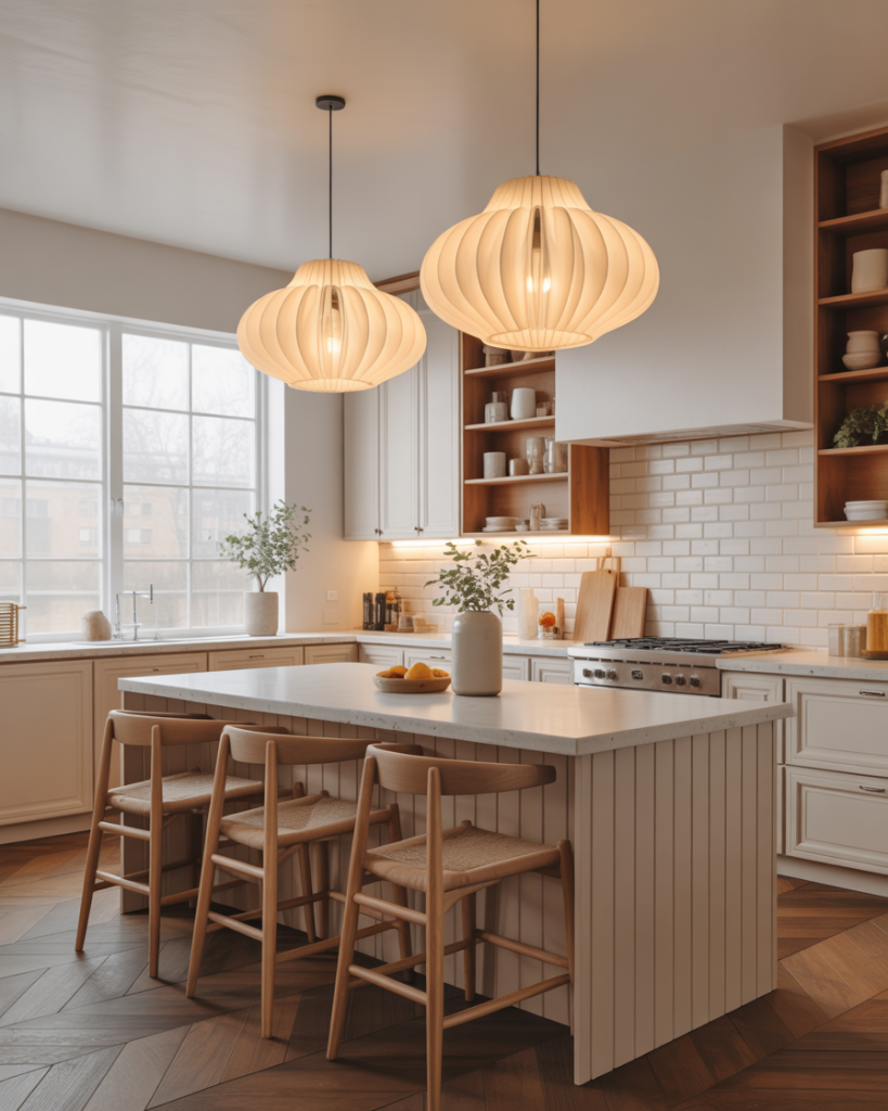 Oversized linen domes, glass orbs, or woven basket pendant lights replace industrial cages of the past. Layered light fixtures over the sink, island, and prep areas create atmosphere, not just visibility. Proper lighting turns a plain kitchen into a memorable one, something I learned when a single ceiling bulb made my remodel feel like a garage.