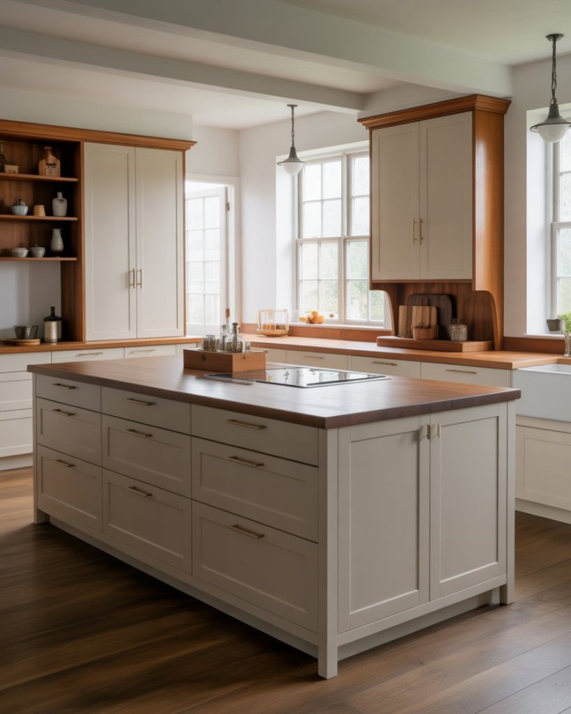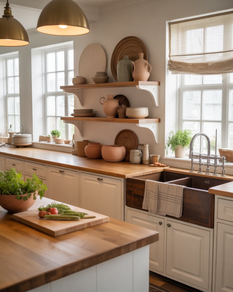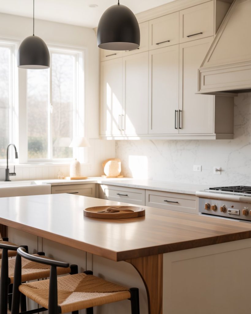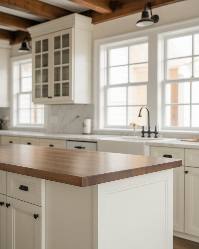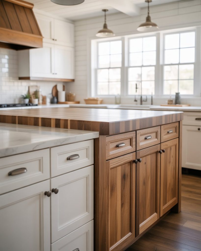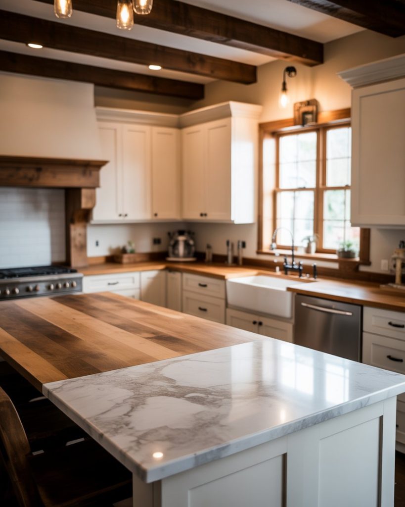 Mixing marble with butcher block countertops creates tactile contrast and visual richness. The stone provides durability, while wood adds warmth, capturing both old-world craftsmanship and modern simplicity. This pairing defines the next evolution of 2026 farmhouse elegance.