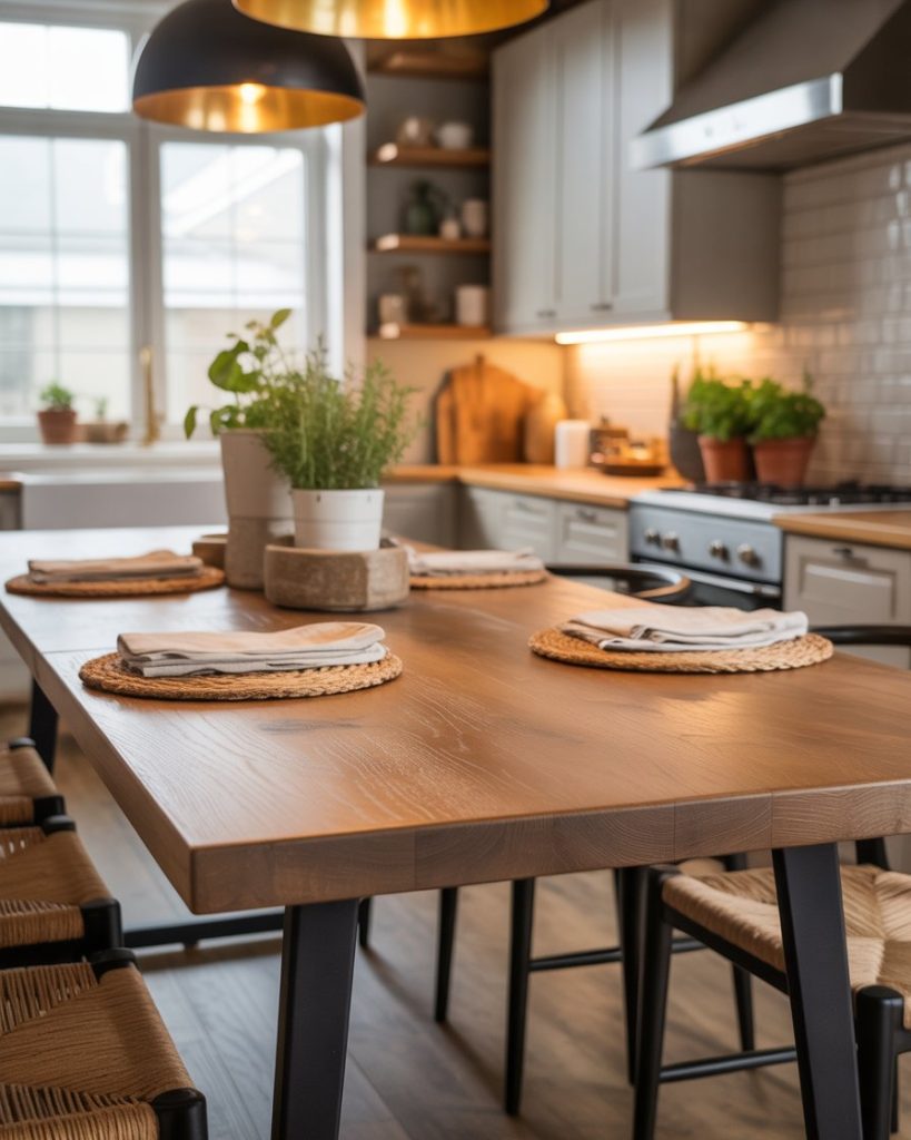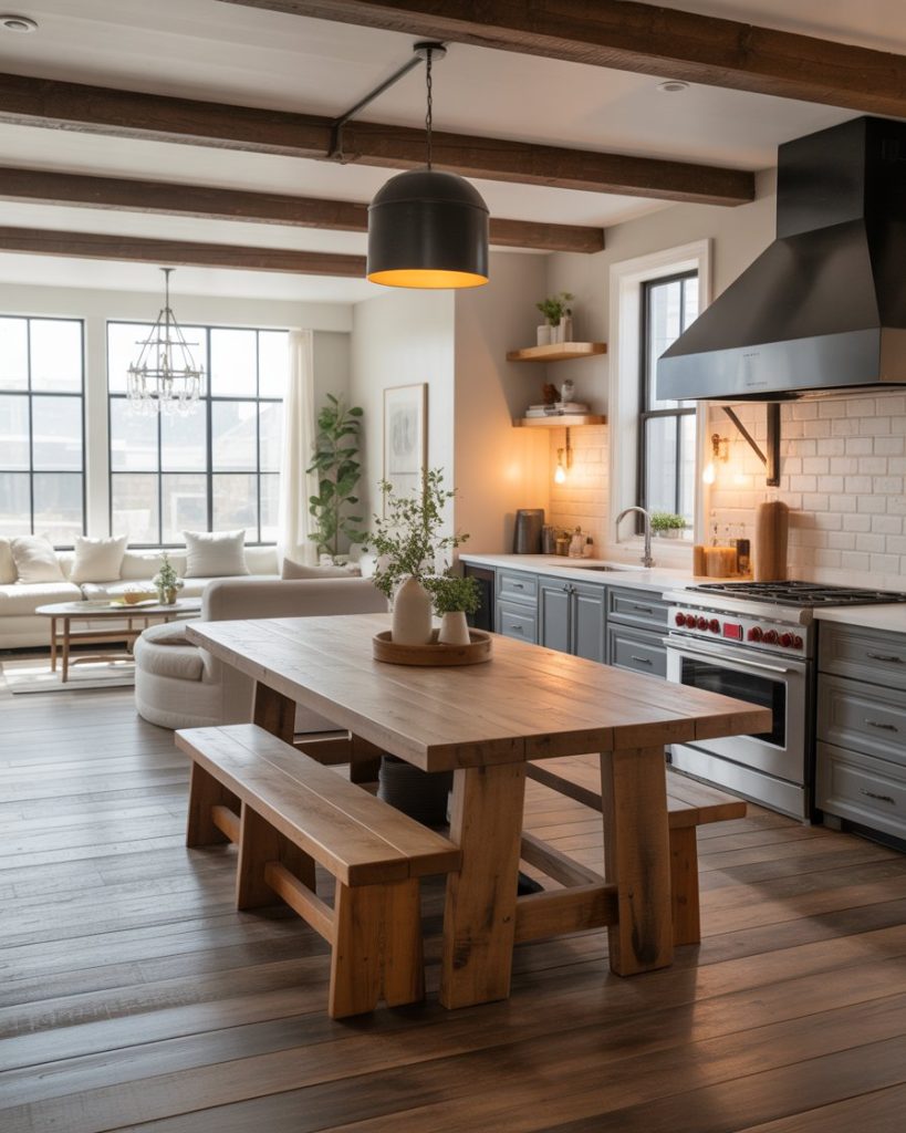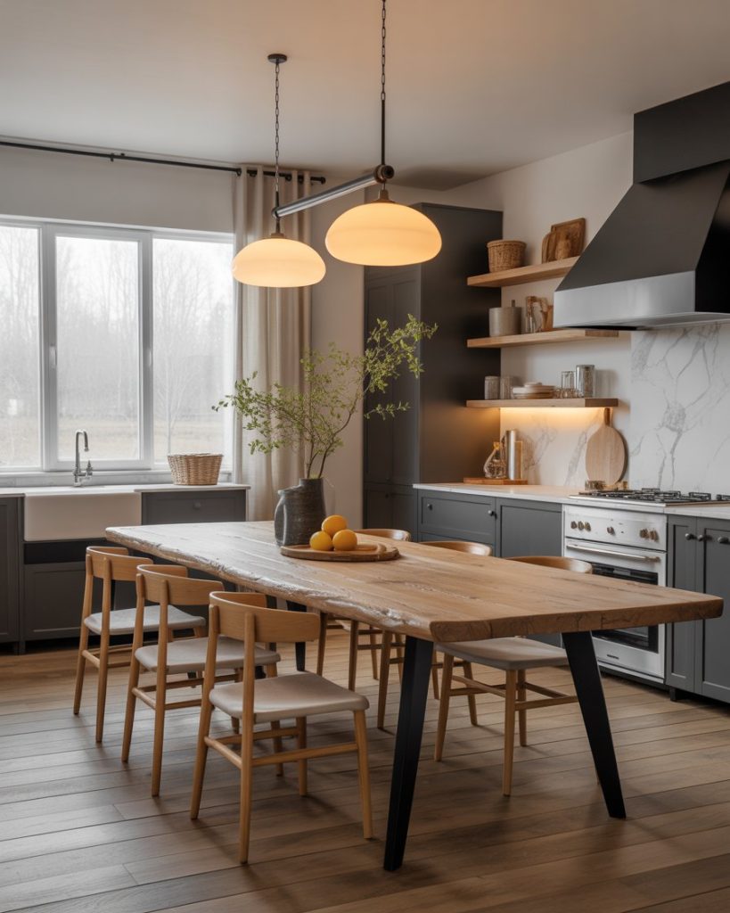 The heart of a modern farmhouse kitchen is often the dining table, now updated with reclaimed oak, marble inlays, or matte black legs. These designs mix classic durability with modern flair, ideal for family gatherings or daily meals. Adding natural linen runners or handmade pottery keeps the look grounded yet elevated.