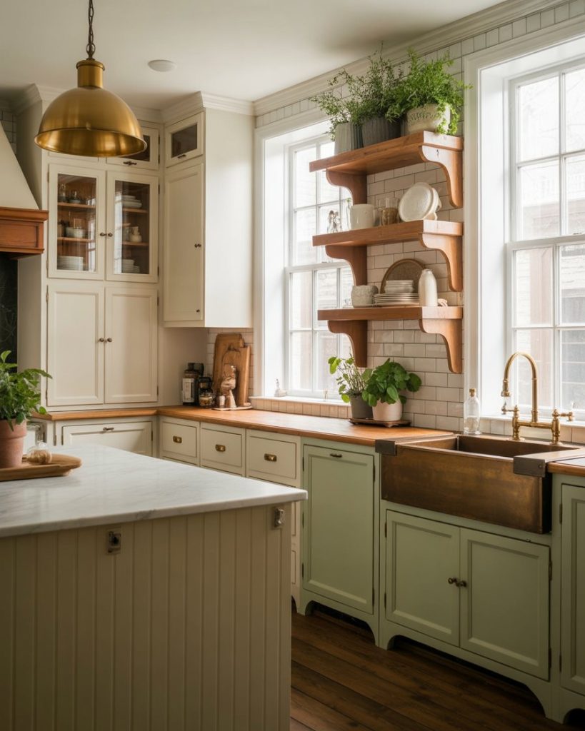Using contrasting paint colors—like cream on top and deep forest green below—creates dimension in compact kitchens. This trend pairs beautifully with brass fixtures and rustic wood shelves. It’s an affordable way to refresh a space without replacing all your cabinets.