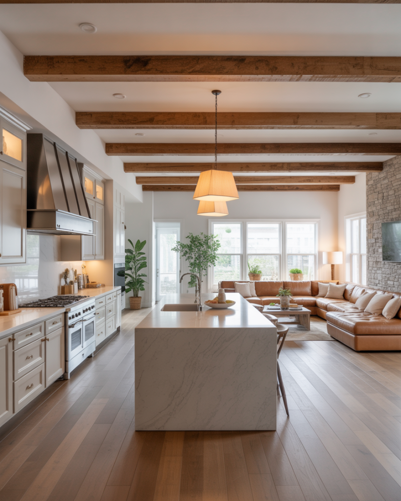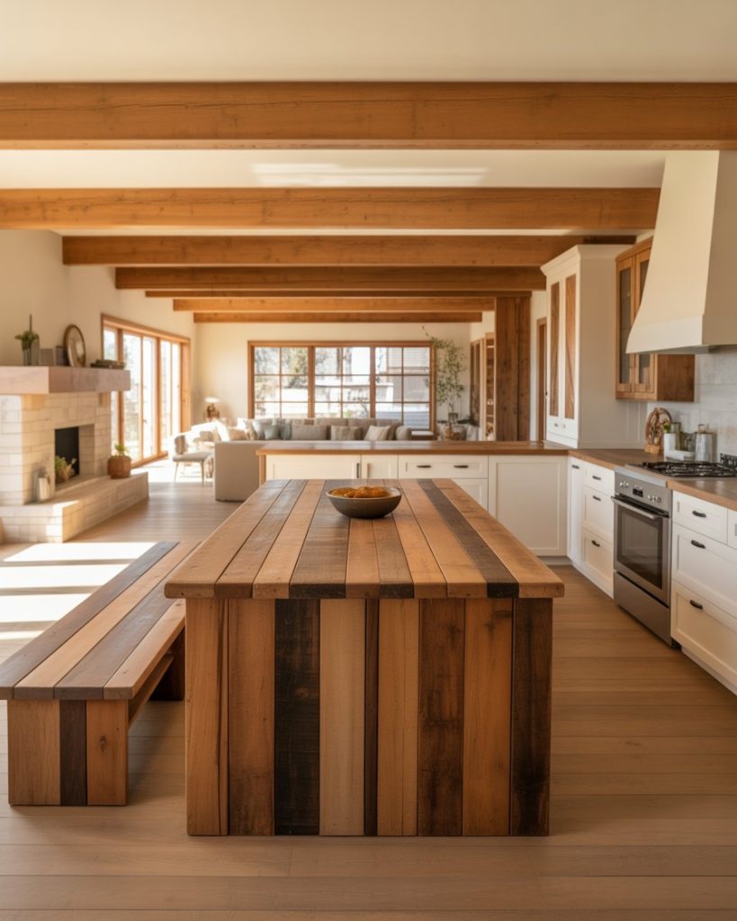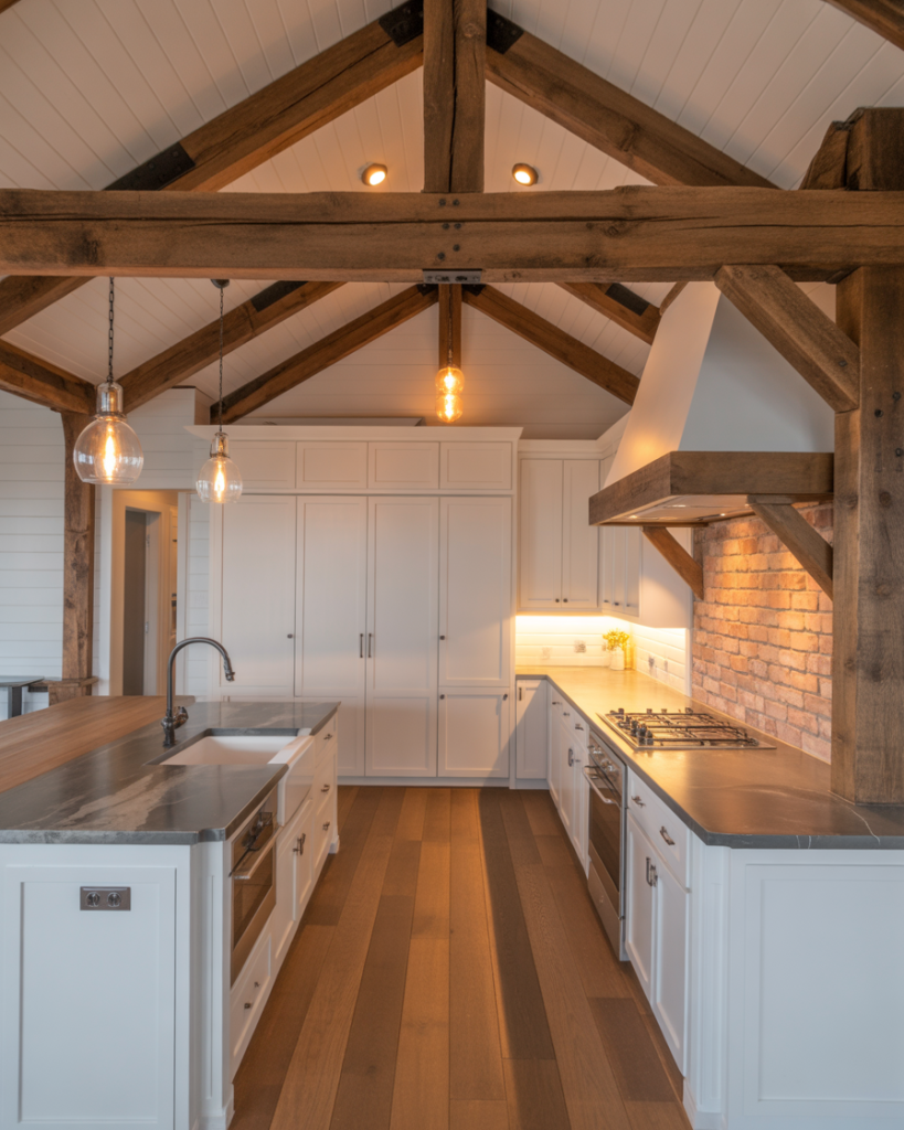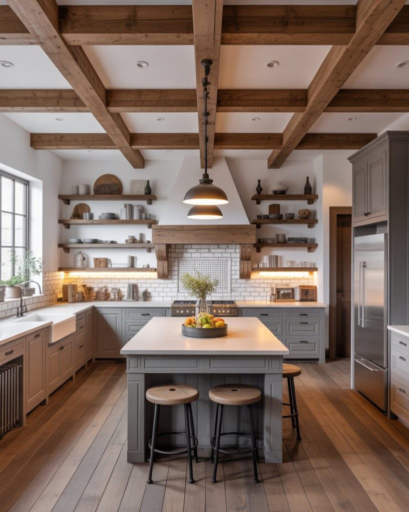 Exposed wood beams remain a signature decor element, but in 2026 they’re paired with polished stone and minimalist fixtures for balance. A mix of old and new makes the kitchen feel architectural yet approachable. The beams tie together natural warmth and modern design precision.