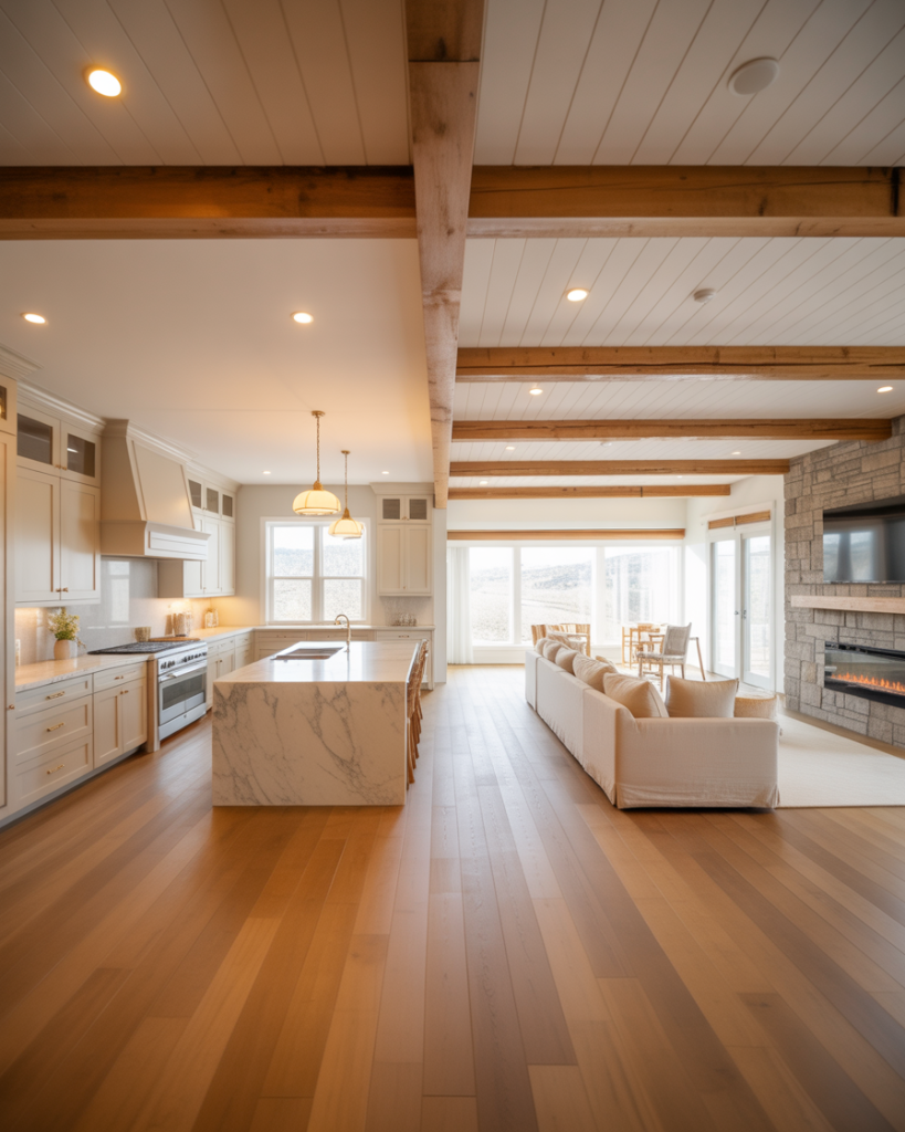 Open-plan homes merge the living room with the kitchen to encourage flow and family connection. Matching light fixtures or repeating wood tones create cohesion. This idea works especially well for small houses that need multifunctional comfort zones while keeping a farmhouse heart.