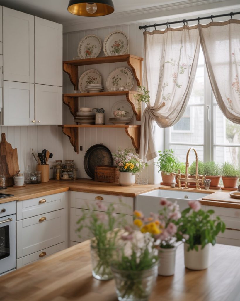 Cottagecore nostalgia blends perfectly with 2026 modern farmhouse design ideas. Soft florals, open shelving, and antique brass details keep spaces cozy yet practical. Combining these textures with minimalist furniture adds both romantic charm and modern refinement.
