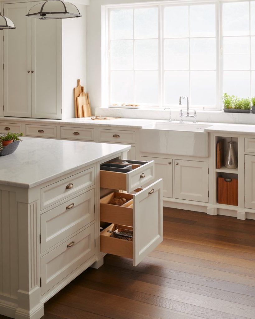 Creative storage ideas like built-in drawers inside the island, pull-out spice racks, and concealed sink compartments keep the space neat. Homeowners in 2026 prioritize clean aesthetics, balancing practicality with minimal clutter for effortless everyday use.