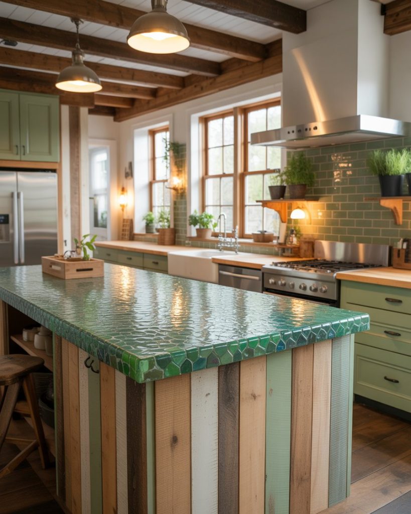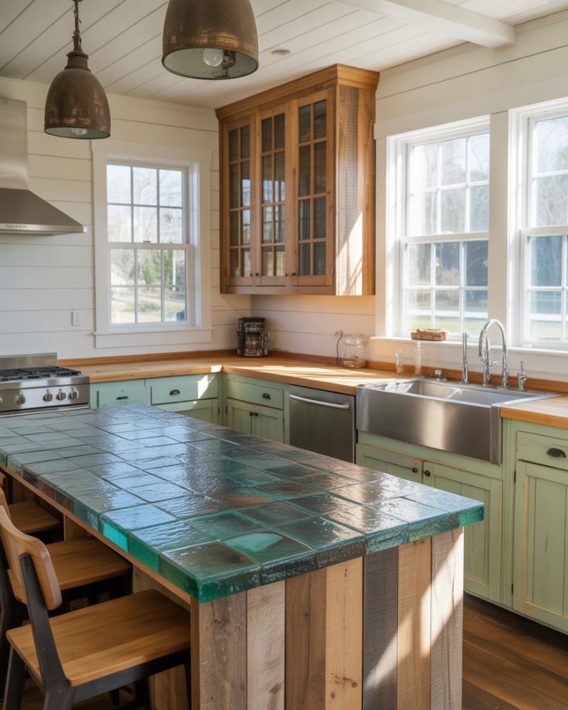 Reclaimed wood, recycled glass countertops, and eco paint colors define sustainability-driven farmhouse kitchens. Designers highlight the charm of imperfection and environmental care. These choices make every space not only stylish but also consciously crafted.