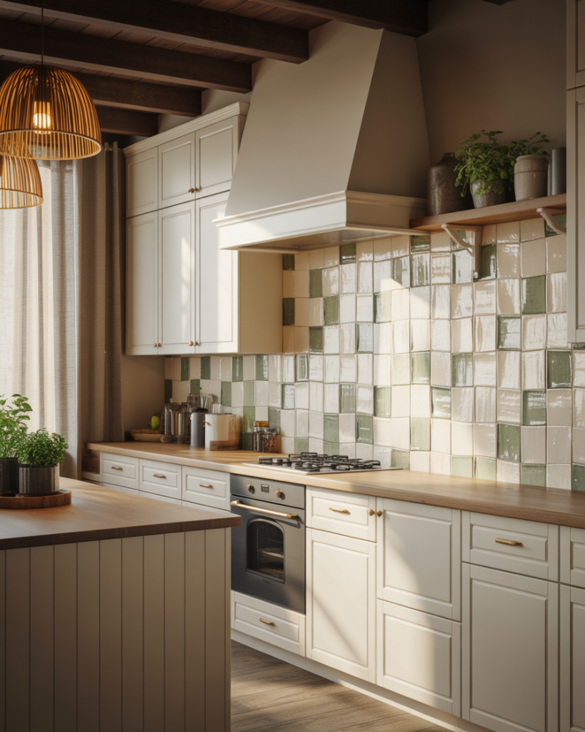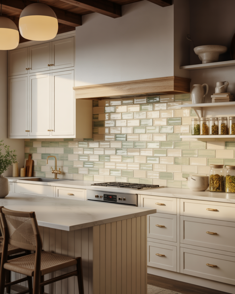 A handmade backsplash tile adds depth without loud colors or patterns. Pairing a backsplash with white cabinets keeps the kitchen bright, but slight glaze variation makes the wall feel artisanal instead of flat. Designers note that imperfect texture now signals luxury more than polished surfaces ever did.