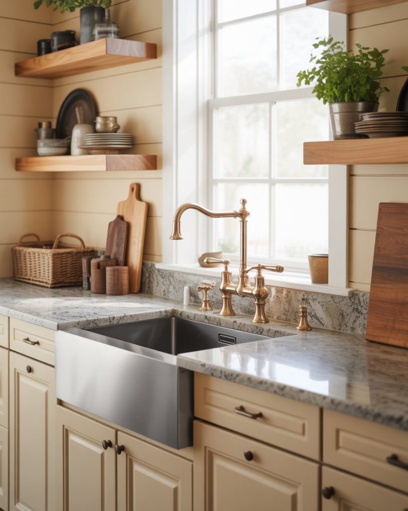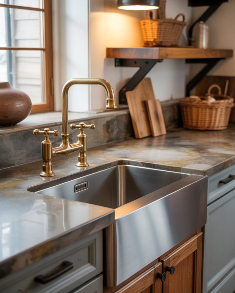 The classic farm sink is evolving into brushed nickel, aged copper, and blackened steel versions. Paired with stone countertops and curved faucets, it blends rustic soul with refined edges. Joanna Gaines calls the sink “the smile of the kitchen,” and these new materials give it real personality.