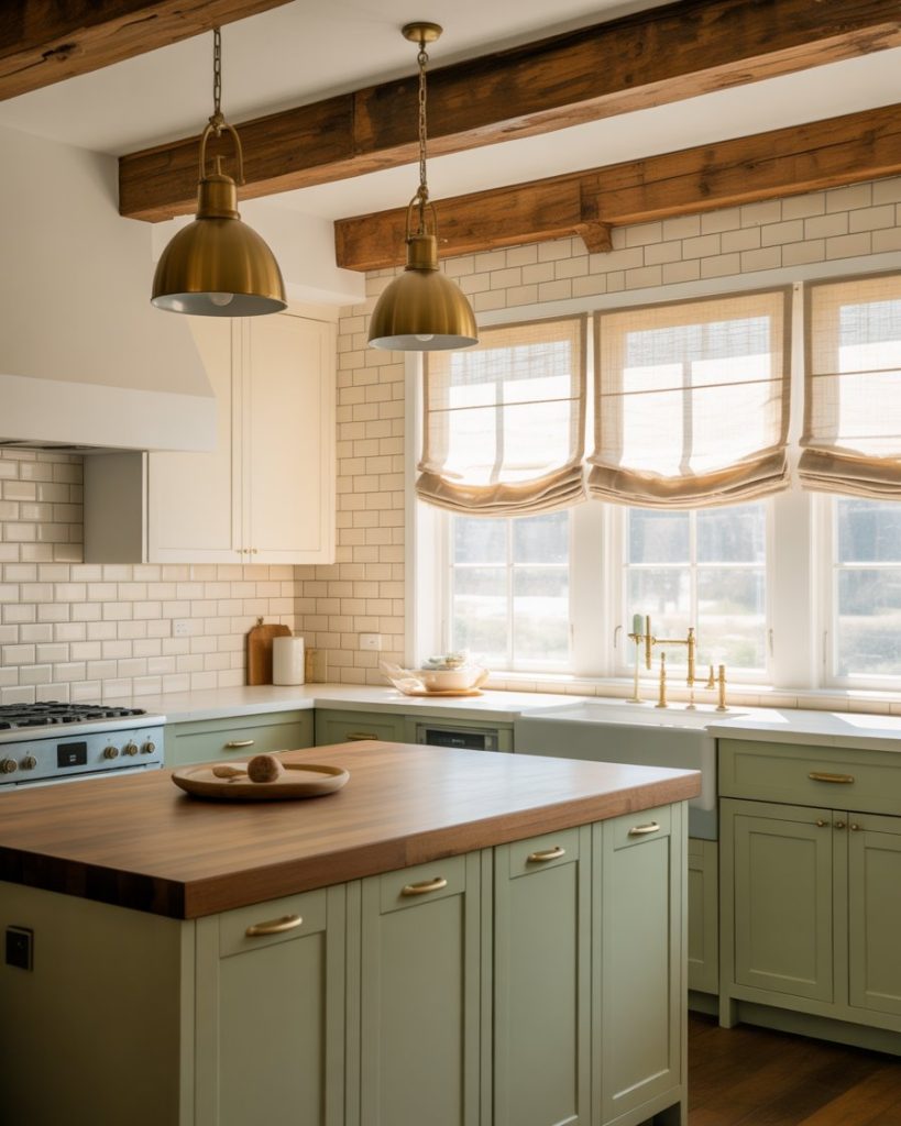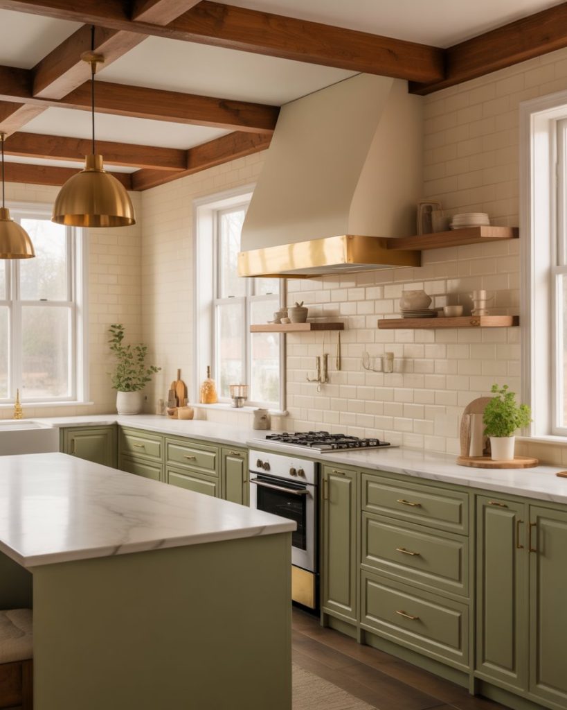 Sage, olive, and deep green tones are becoming the go-to design ideas for cabinets and trim. The color softens wood beams, brass hardware, and creamy walls, creating a calming space after the chaos of 2025 remodel delays. Green feels rooted in nature but still fresh enough for modern homes.