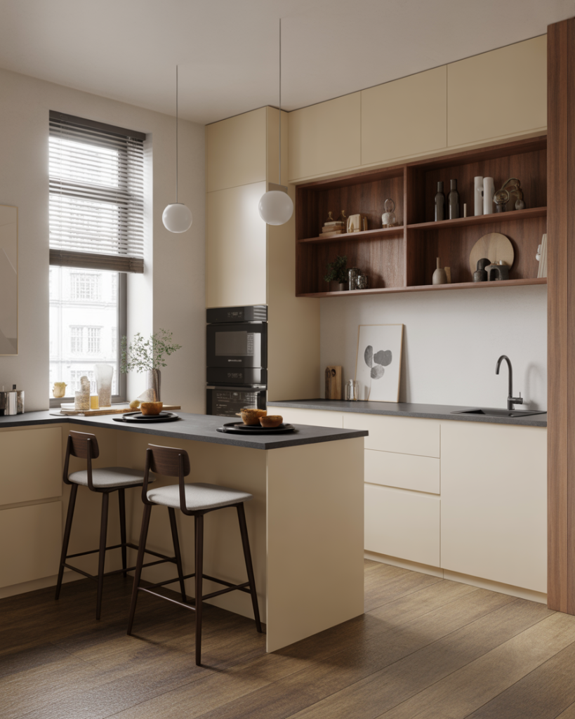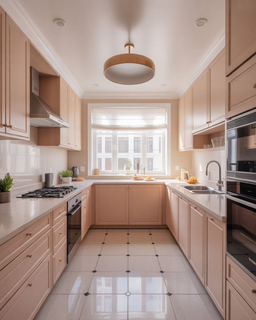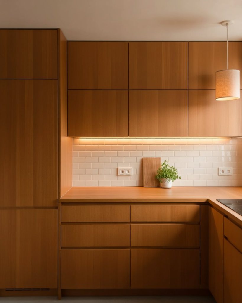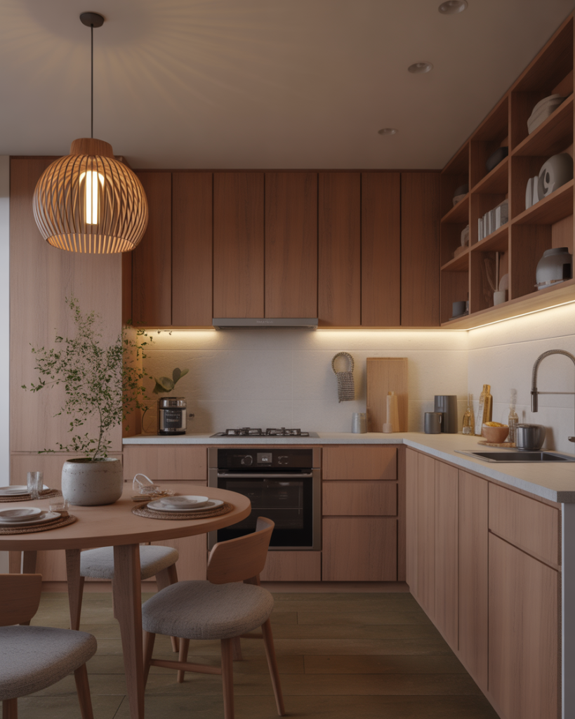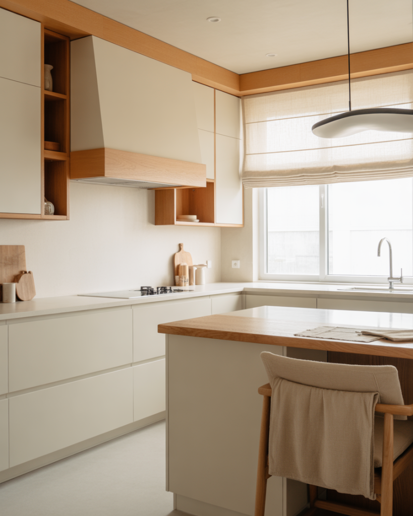 A warm toned Minimalist Kitchen feels naturally Cozy, pulling from the subtle charm of Rustic Scandinavian influences while still reading as clean and Contemporary. This works perfect for Small spaces, especially if you like a Simple layout having hidden storage and streamlined hardware that mimics designs seen on calm, uncluttered energy attracting Apartment Therabpy.
