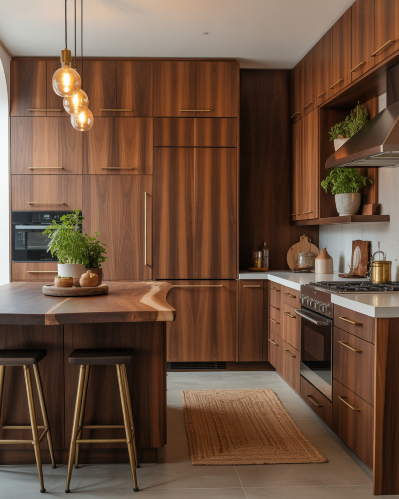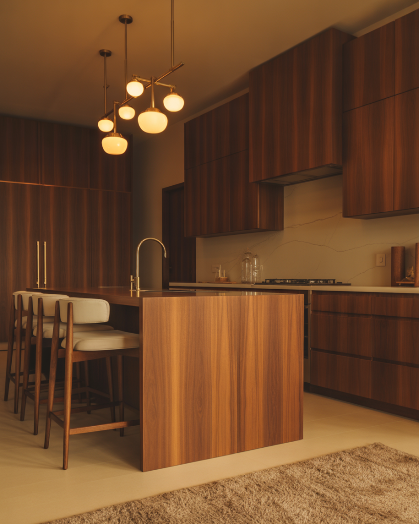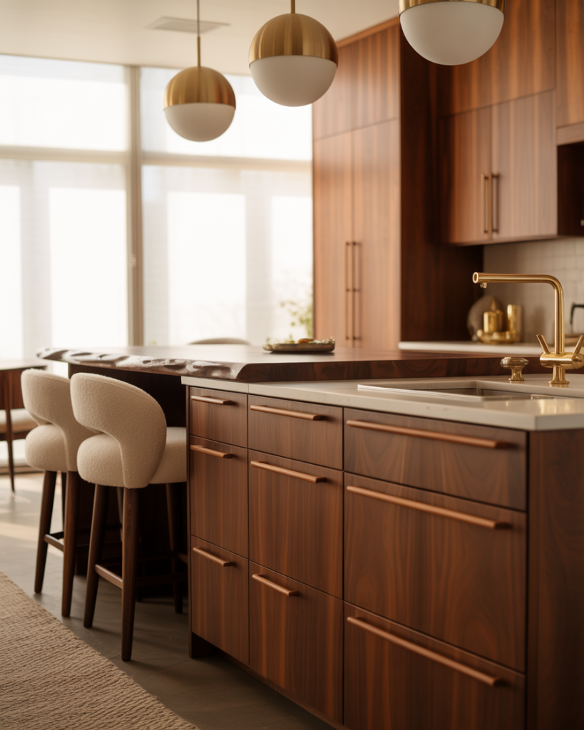 A refined mid-century layout paired with luxury finishes blends classic design with today’s comfort. Walnut cabinets, globe lighting, and brass details make the space feel elevated without losing warmth. Design magazines frequently reference this as a timeless look that suits both retro lovers and modern homeowners.