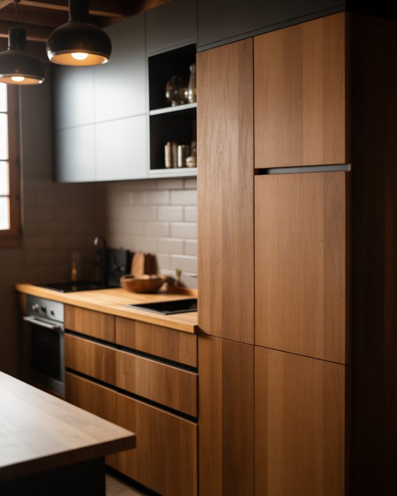 A rustic yet minimalist kitchen combines raw textures with clean geometry, giving the room a grounded but modern feel. This idea works especially well in small spaces, where natural wood softens the simplicity of flat-front cabinets. Many homeowners say it reminds them of boutique mountain rentals that feel both warm and uncluttered.