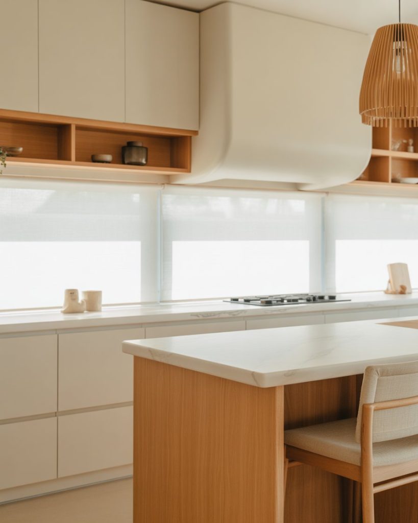 A soft white kitchen with organic textures feels instantly calming and bright. Woven baskets, matte ceramics, and light oak elements echo trends designers expect for 2026, creating a soothing environment for cooking and gathering. This idea is perfect for anyone craving a peaceful, spa-like kitchen atmosphere.