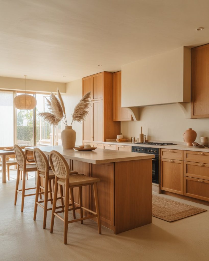 An aesthetic kitchen inspired by boho and organic textures feels breezy and personal. Rattan stools, earthy shelves, and handcrafted ceramics soften sleek cabinetry, creating a relaxed vibe similar to what you see in stylish California homes. This look shines in apartments and family kitchens alike, giving the room soulful warmth while staying intentionally modern.