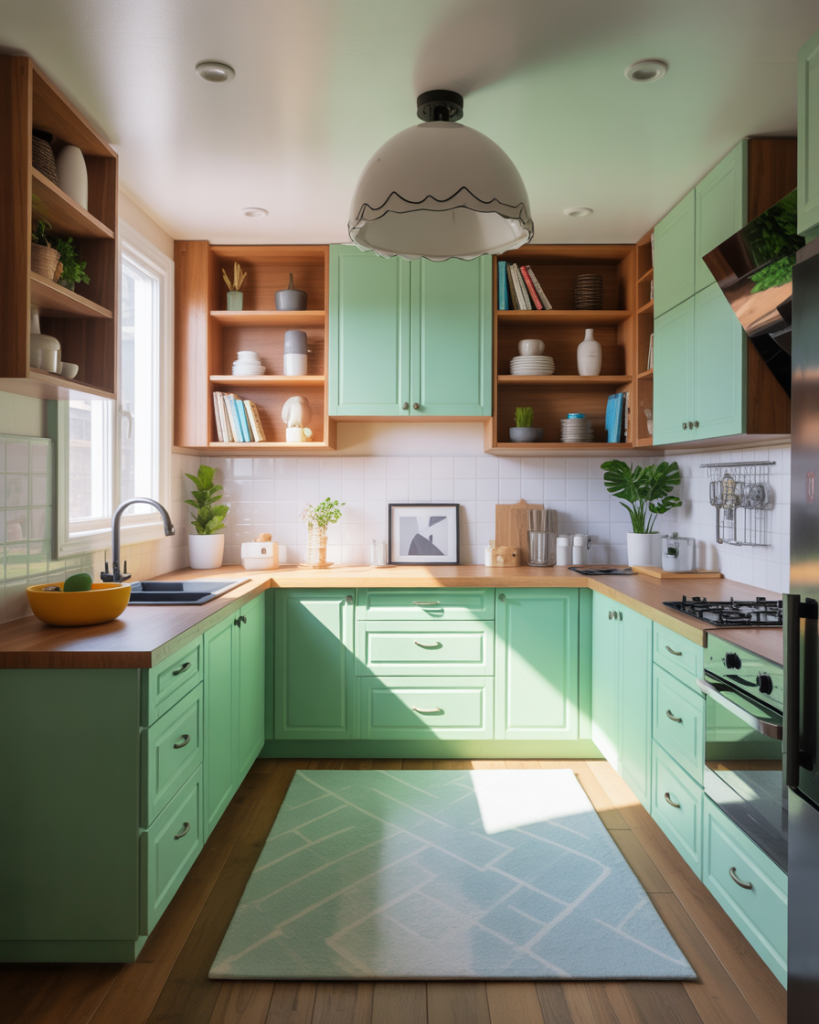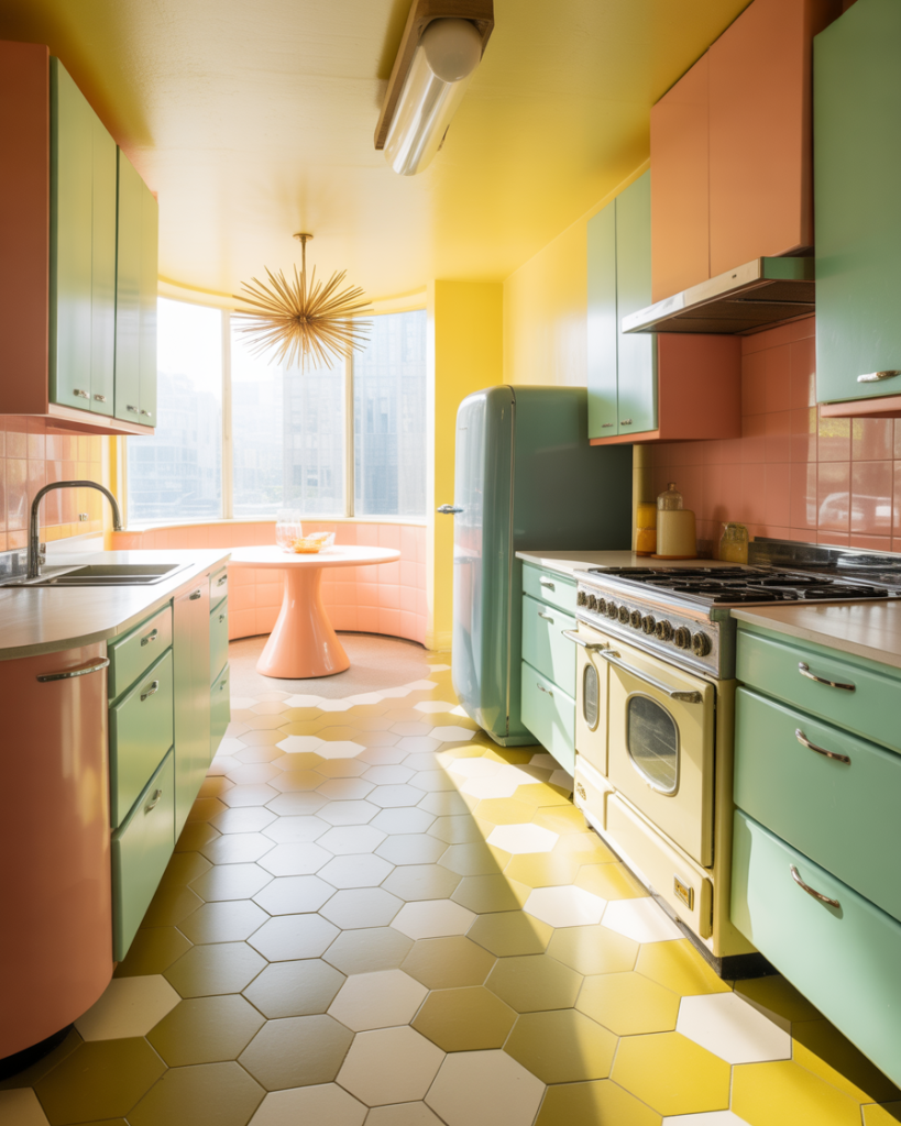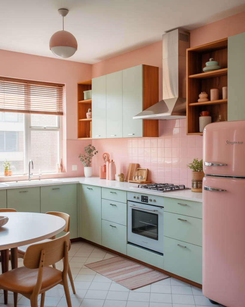 A retro kitchen with pastel accents adds fun energy and a charming aesthetic twist. Mint, butter yellow, or soft pinks create a cheerful mood, drawing inspiration from playful 1950s palettes. This idea is great for anyone who wants a kitchen that makes everyday tasks feel a bit brighter.