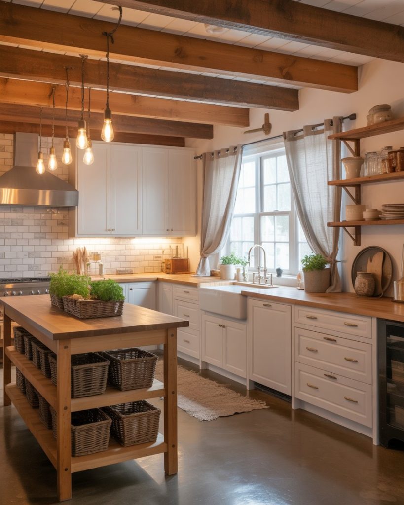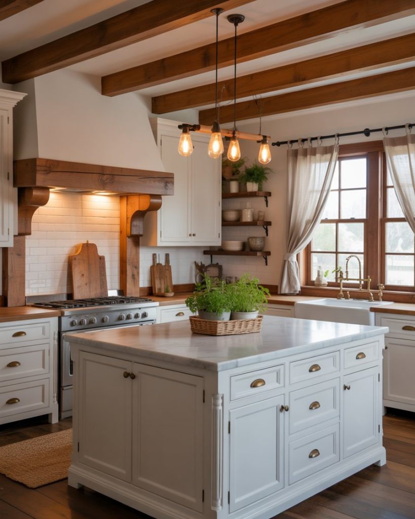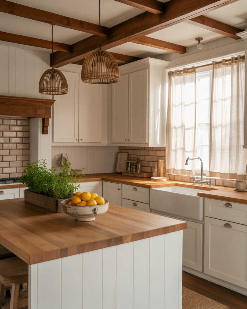 A cozy farmhouse kitchen with clean lines leans into comfort without clutter. Neutral cabinets, shaker profiles, and wood accents create a gentle mix of tradition and modern simplicity. This idea appeals to anyone who wants homey warmth while still keeping things streamlined.