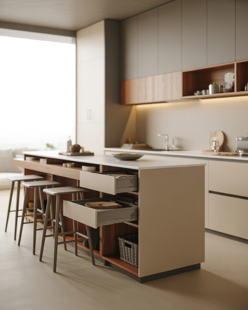 For small spaces, a compact island with storage can transform the way the kitchen functions. Narrow, movable, or fold-out designs work surprisingly well in apartments, offering prep space, seating, and additional organization in one smart piece.