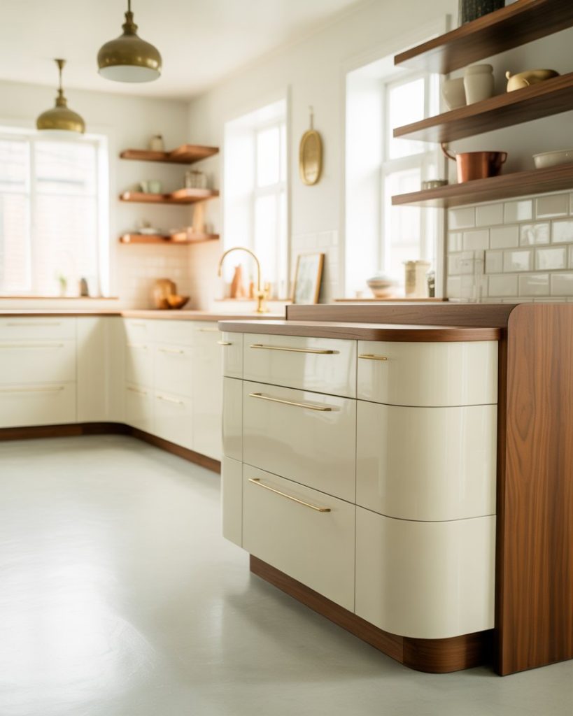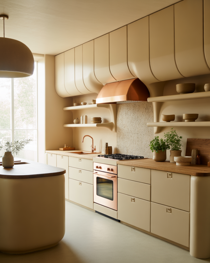 A blended 2025 trend6 style incorporates modern curves, warm metals, airy shelving, and soft minimalist palettes. This idea borrows from editorial kitchens featured on sites like Domino, which emphasize livability rather than perfection. It’s ideal for homeowners who want a kitchen that feels both stylish and approachable, mixing function with gentle sophistication.
