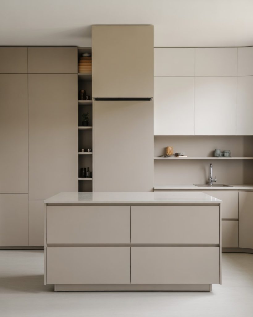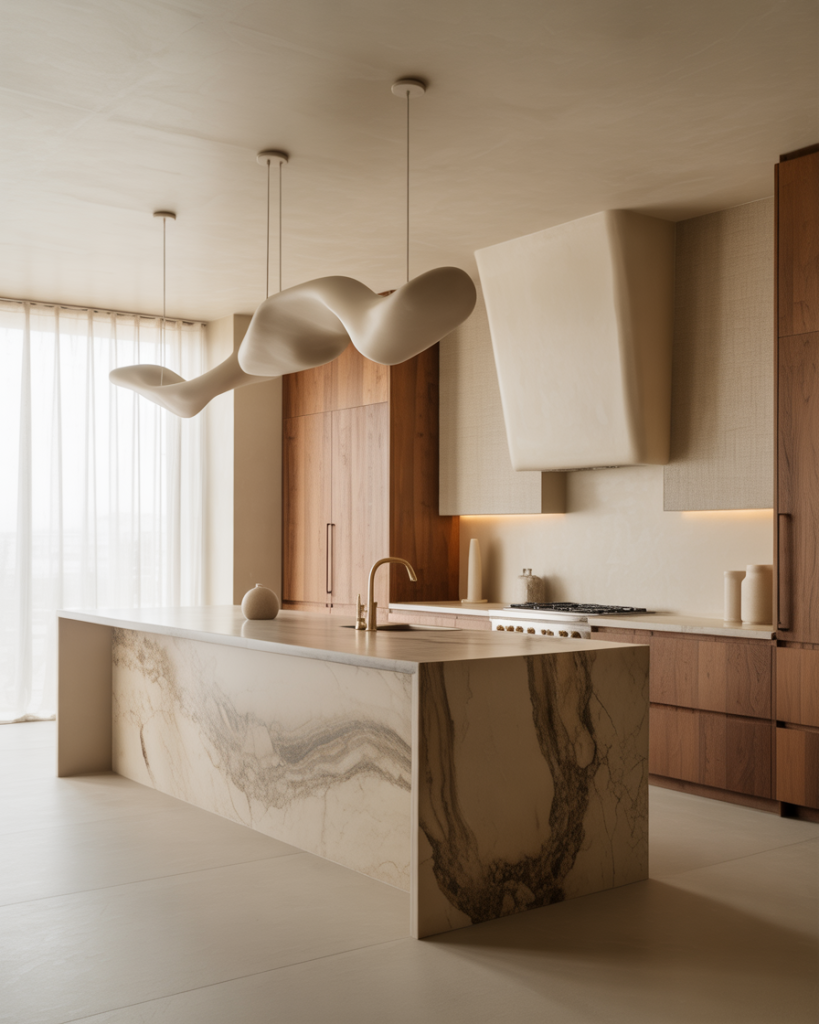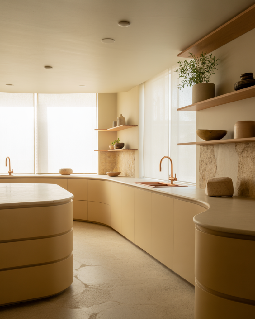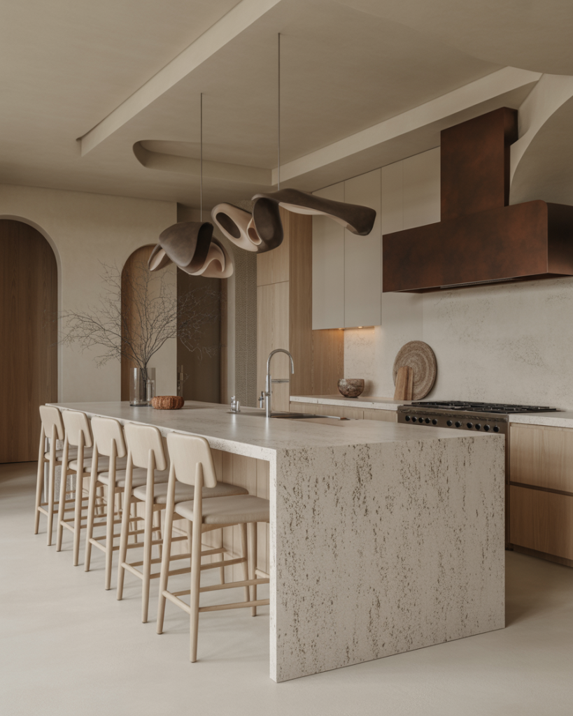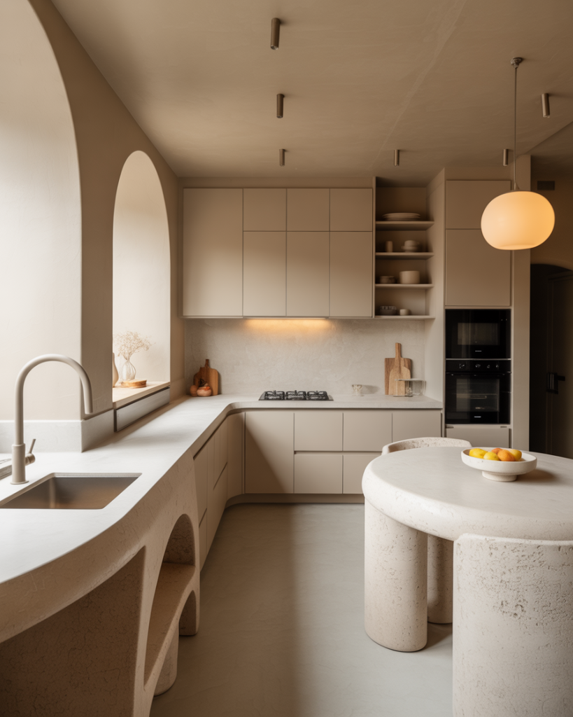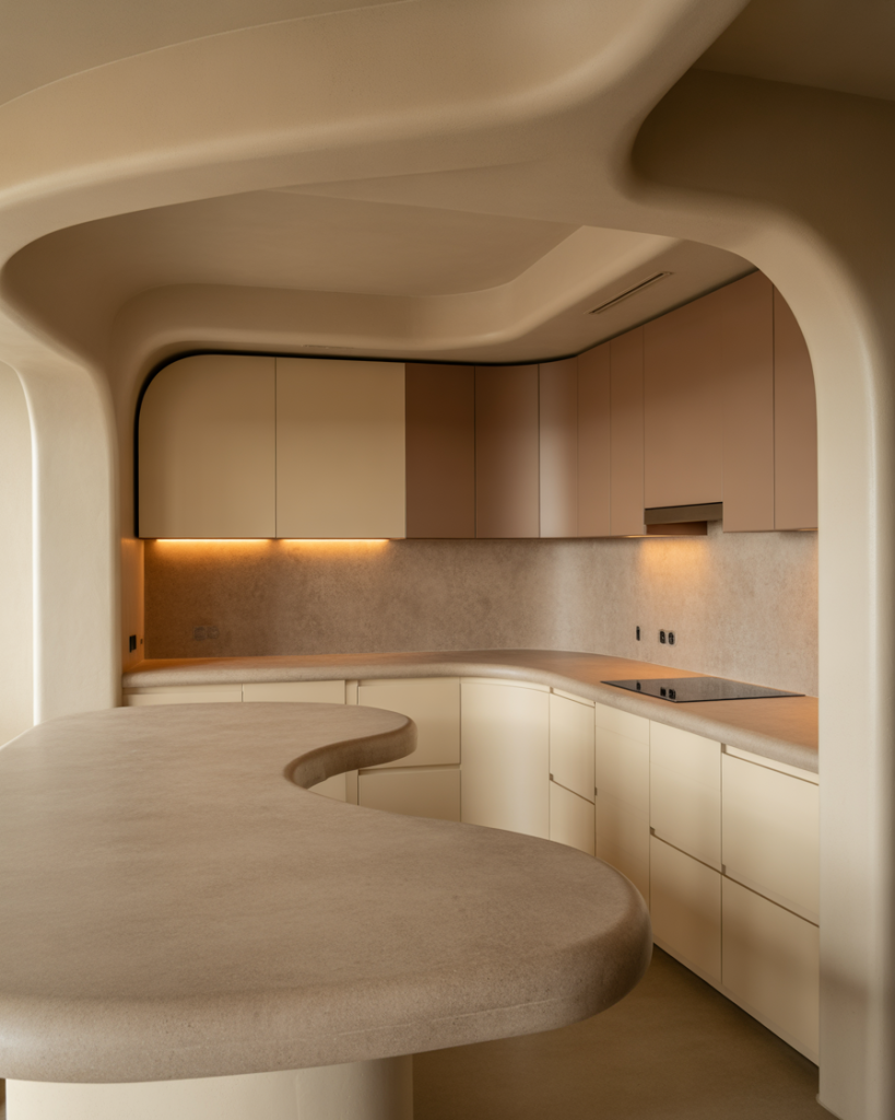 A modern kitchen with organic stone and contemporary shapes delivers earthy elegance. Curved counters, matte stone, and soft neutral tones create a soothing yet upscale aesthetic. This idea suits homeowners who love natural materials and calming palettes.