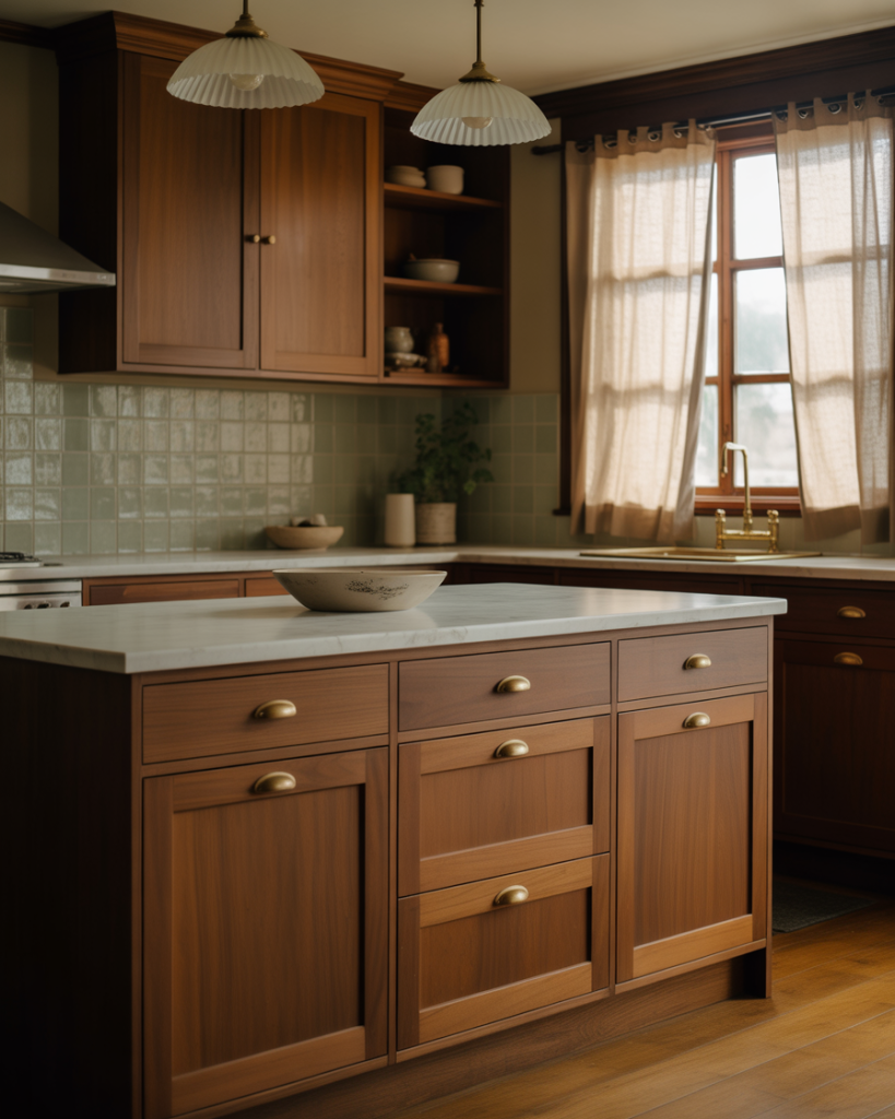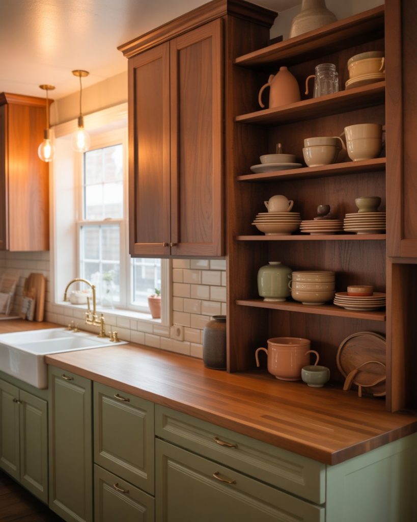 A simple vintage approach uses warm woods, classic pulls, and soft muted colors to create familiarity and charm. This idea works beautifully in older homes or for anyone wanting a nostalgic touch without going full retro. It keeps the look refined while honoring the past.