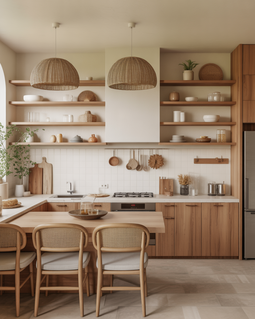 A boho and contemporary hybrid kitchen creates a relaxed yet curated space. Natural fibers, layered textures, and light patterns instantly soften modern cabinetry. This style works in both open plans and apartments, offering personality without sacrificing practicality.