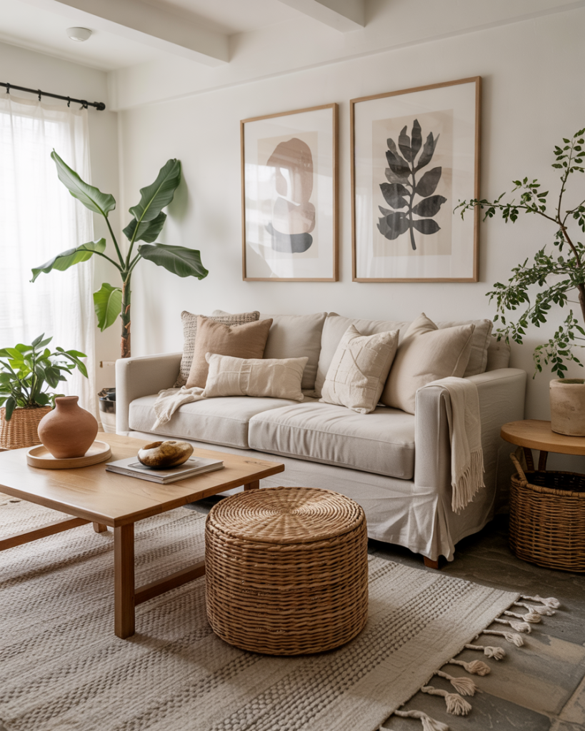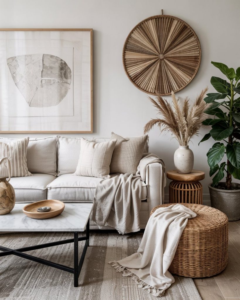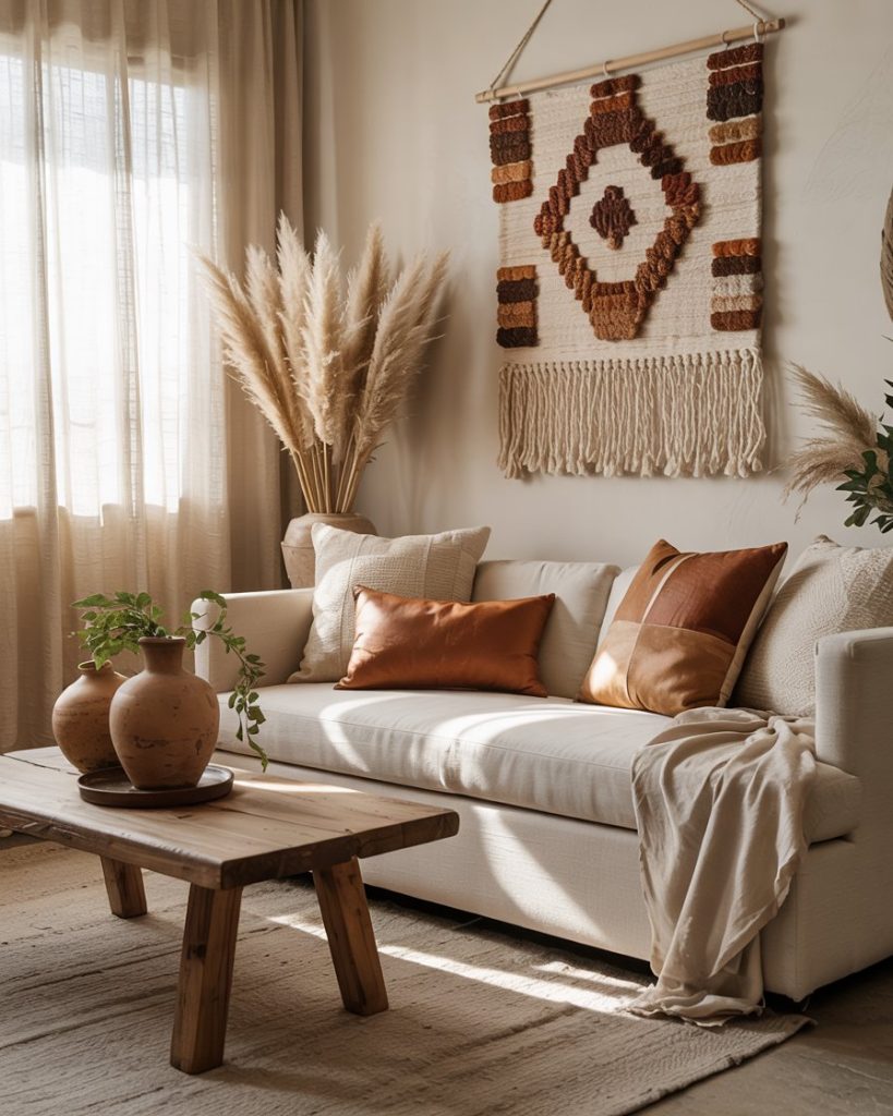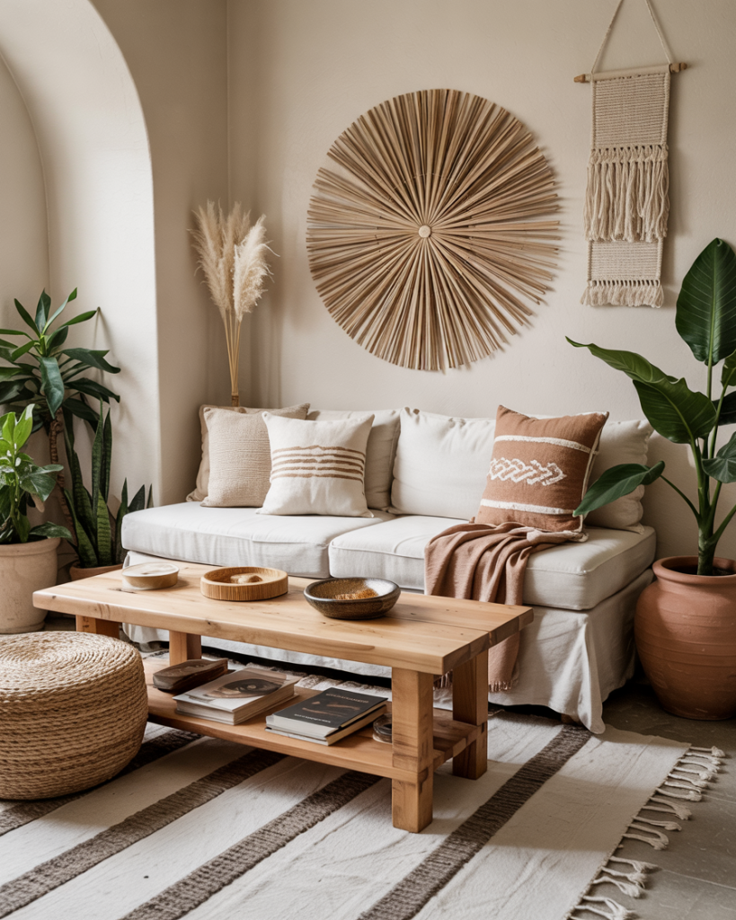 Ideas Decor Earthy, cozy Colors are the heart of this look, mixing oatmeal sofas, stone pottery, and woven baskets for a space that feels collected, not staged. This style works beautifully in an apartment or suburban home alike, because it relies on layering fabrics—linen, cotton, and boucle—to build warmth without visual noise. A single vintage vase or clay lamp instantly adds pedigree, making the room feel lived-in rather than showroom-fresh.