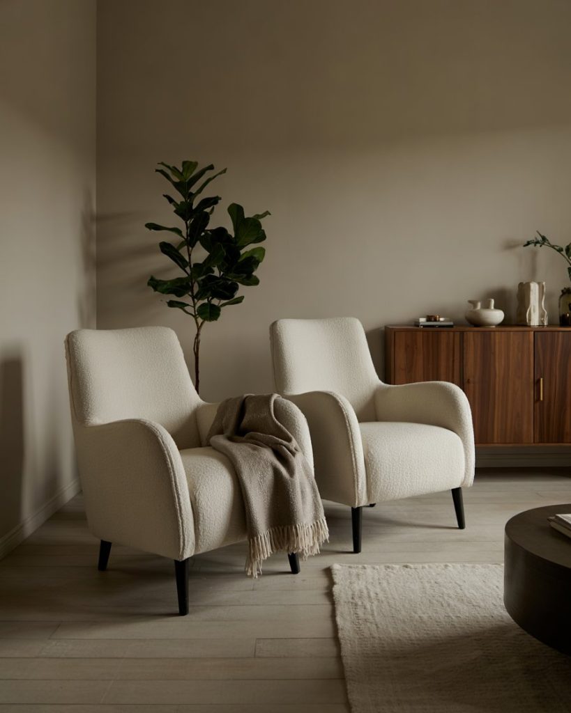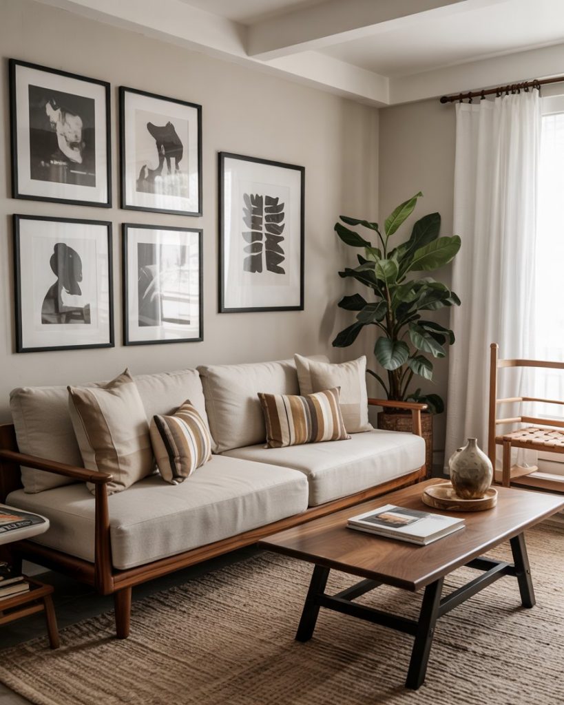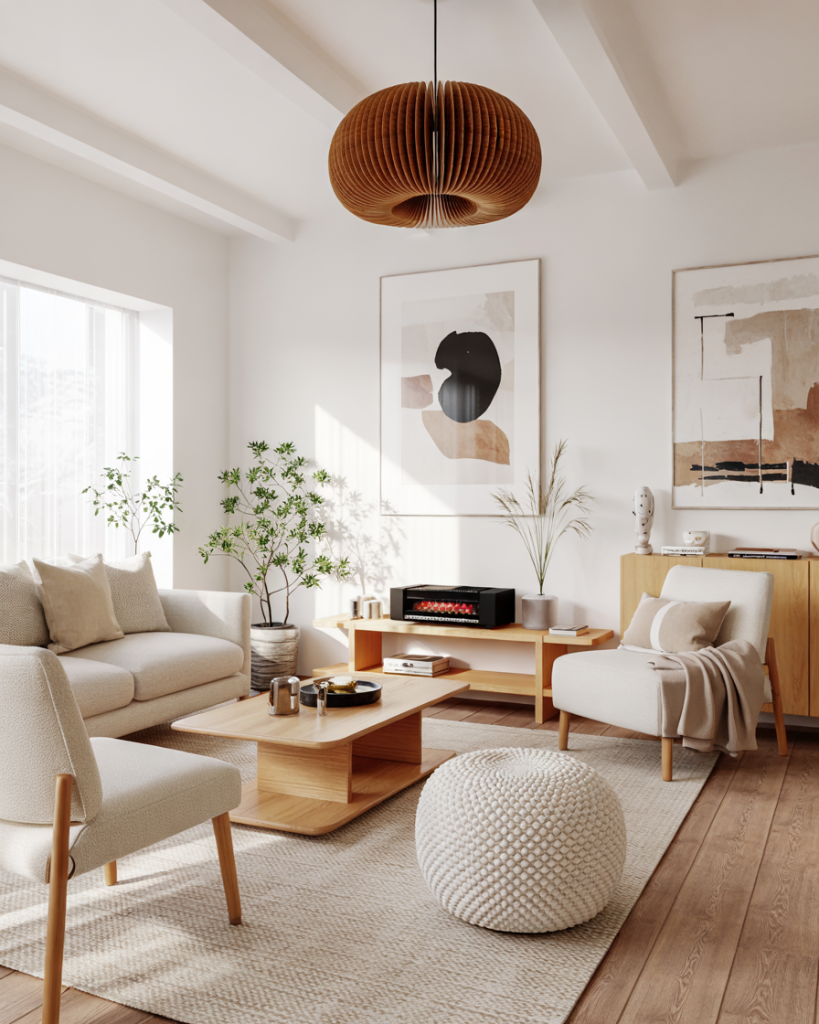 Inspired by Japanese decor and Scandinavian design, this serene Japandi living room combines minimalism and warmth. Light tones of wood, neutral linens, and smooth contours evoke both utility and aesthetics. Each item embodies function, enforcing order and mindfulness. The 2026 version leans towards a softer design, with warm taupe accents and small handcrafted pots to juxtapose austerity and heart. It’s about the interplay of design and lifestyle.