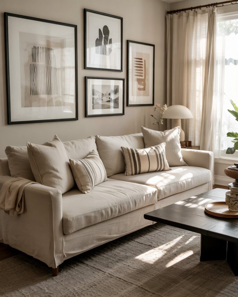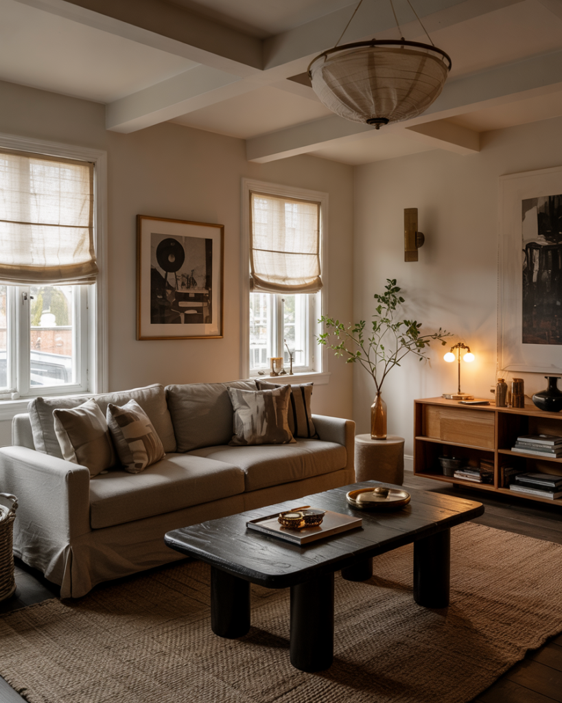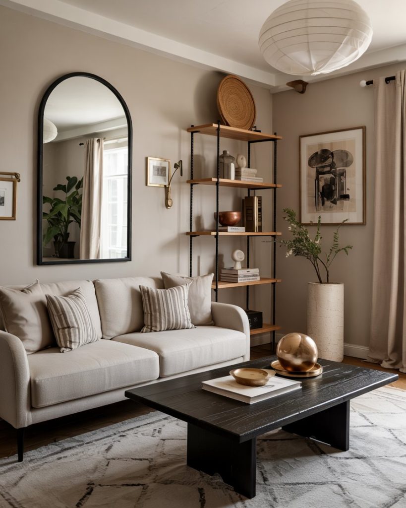Modern Black accents Decor ground pale palettes the way eyeliner defines eyes. Think charcoal window frames, slim metal coffee tables, or a matte black and brass floor lamp. The contrast sharpens beige and cream, helping the room feel intentional instead of unfinished. Even renters can try this with swap-in hardware or framed art in inky tones.