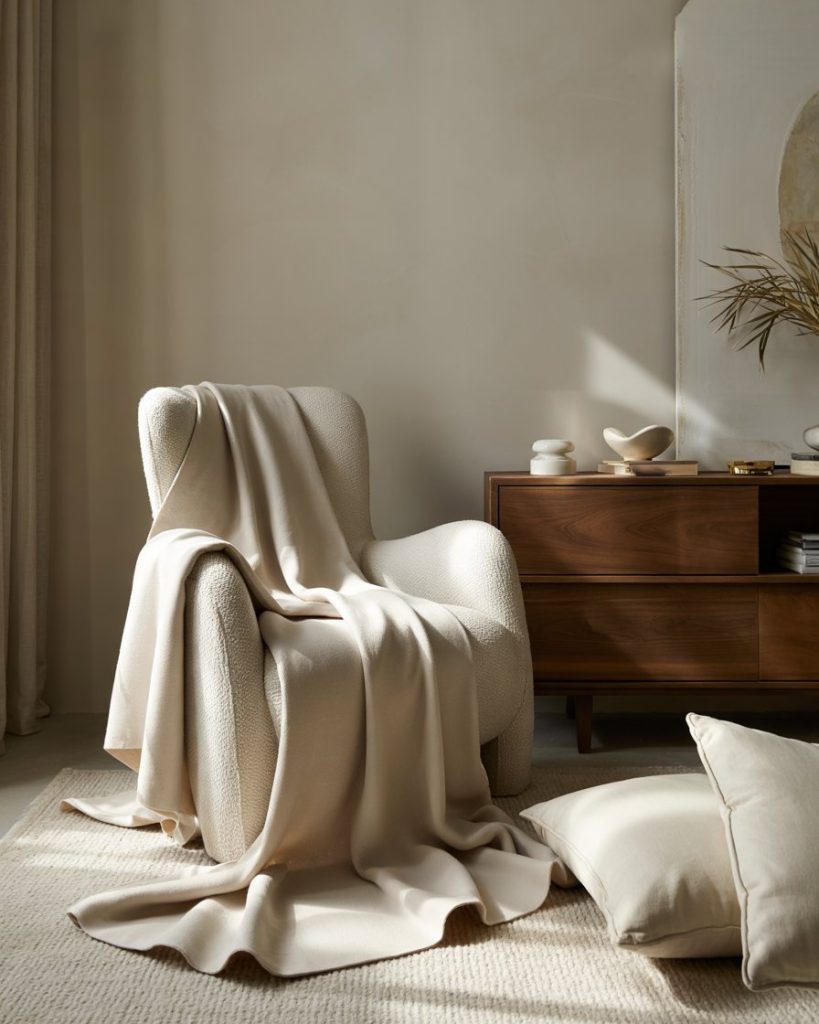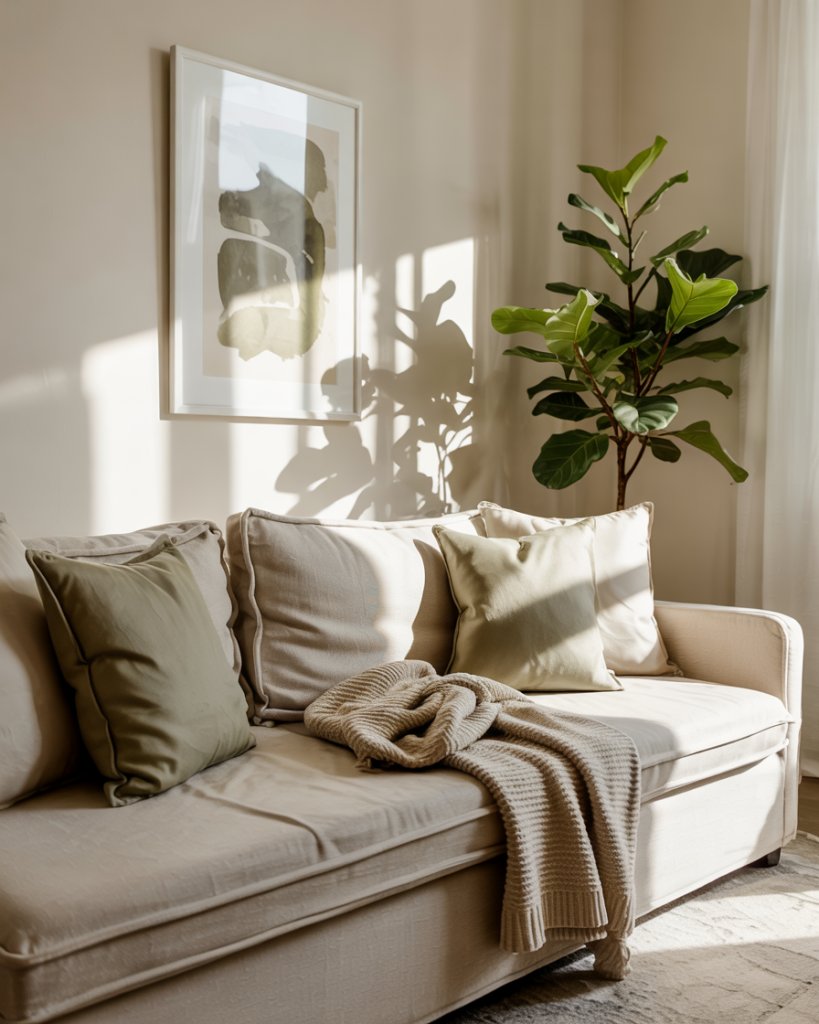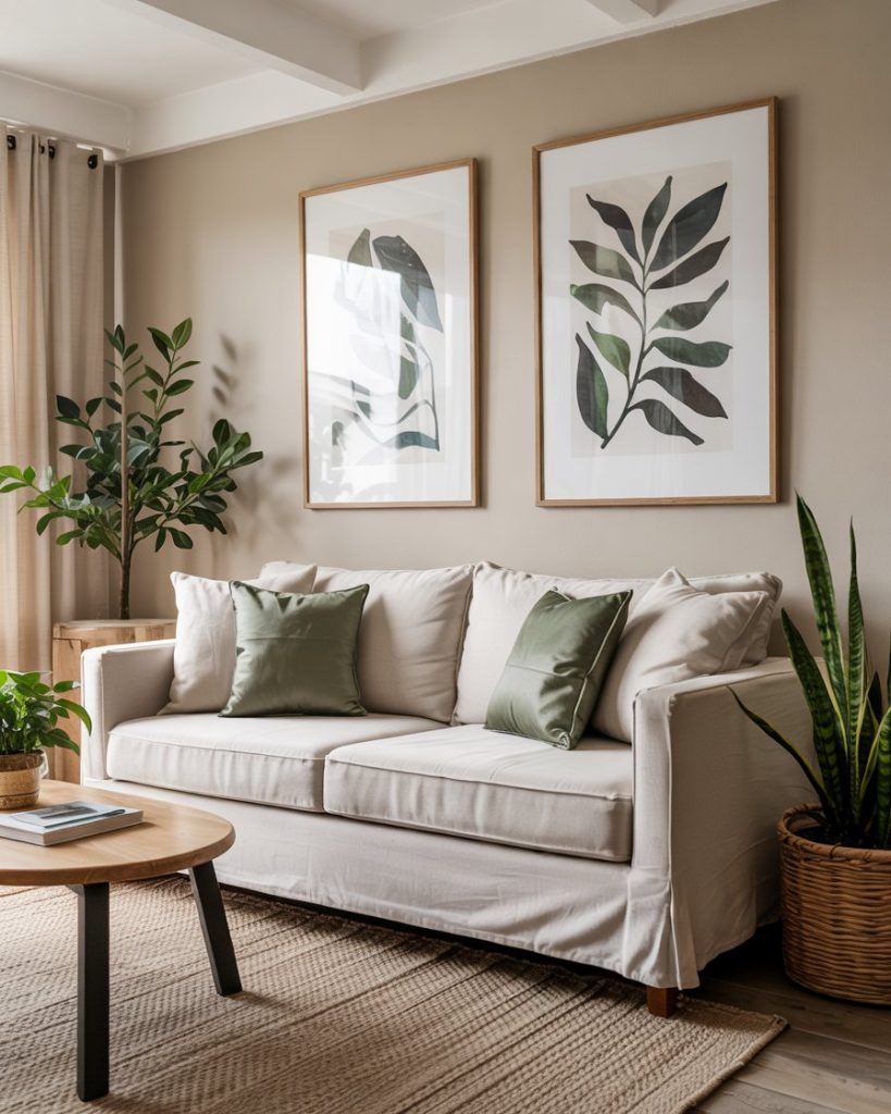 Designers claim green serves as a “bridge” tone between warm and cool neutrals. Add a potted plant or canvas painted in muted green to introduce a quiet optimism. Together with sand and ivory, the effect is organic, timeless, and restorative.