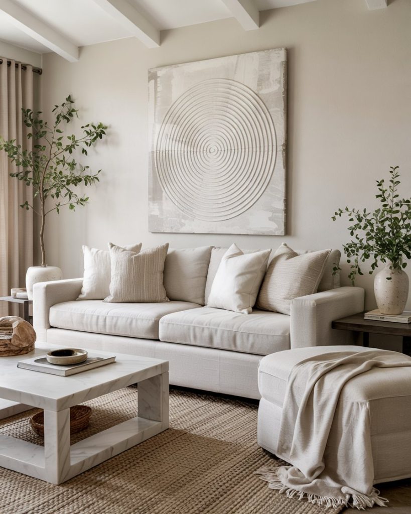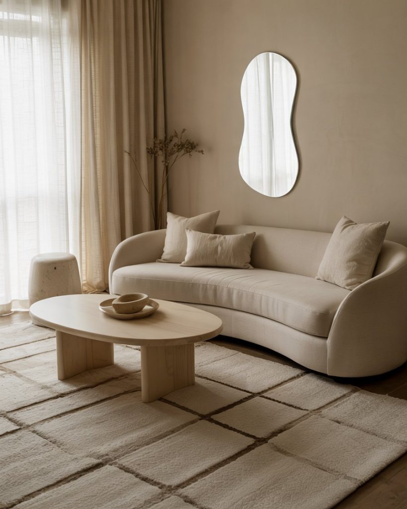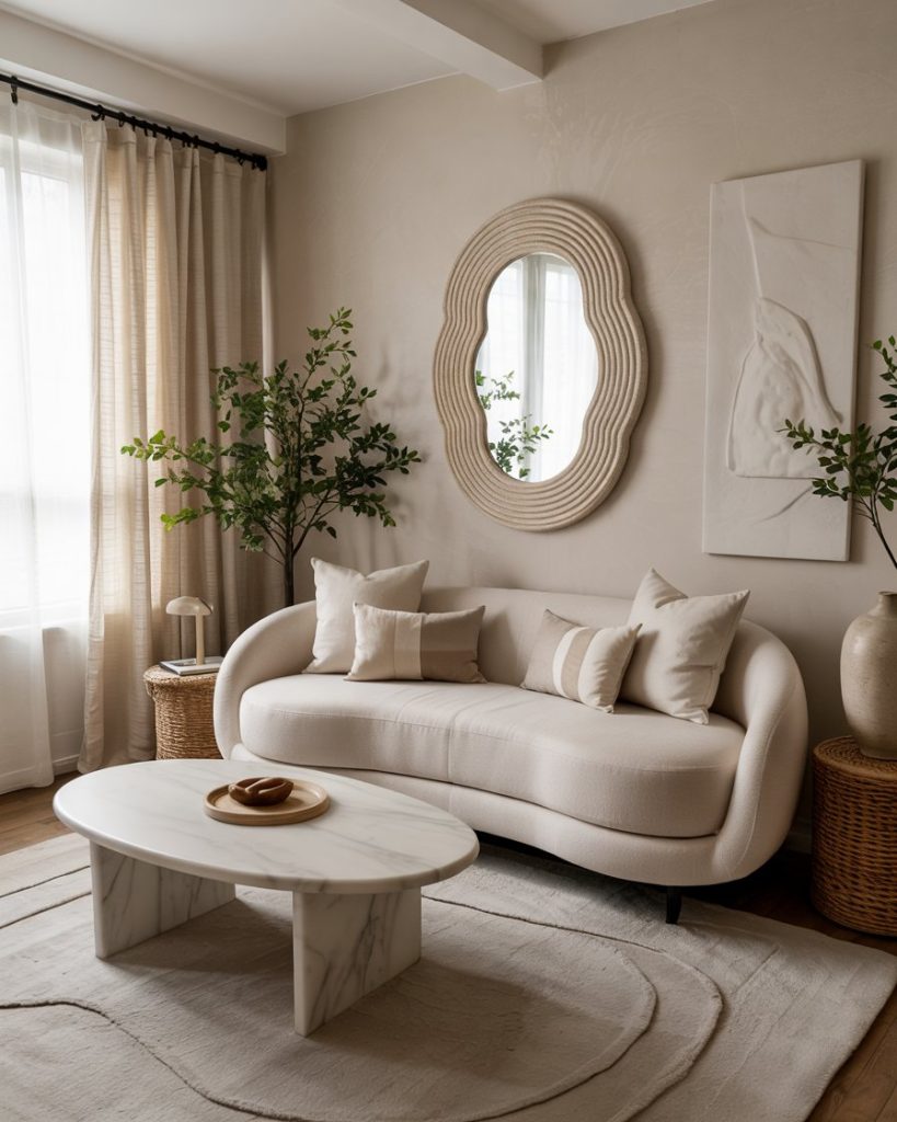 Organic Decor Ideas Colors Modern shapes dominate this year’s furniture trends. Curved sofas, oval coffee tables, and ripple-edge mirrors soften the geometry of a neutral living room. Designers note that rounded forms psychologically calm the eye and promote relaxation. Linen drapes and a rug provide comfort and modern elegance to a space, proving that modern minimalism can be inviting.
