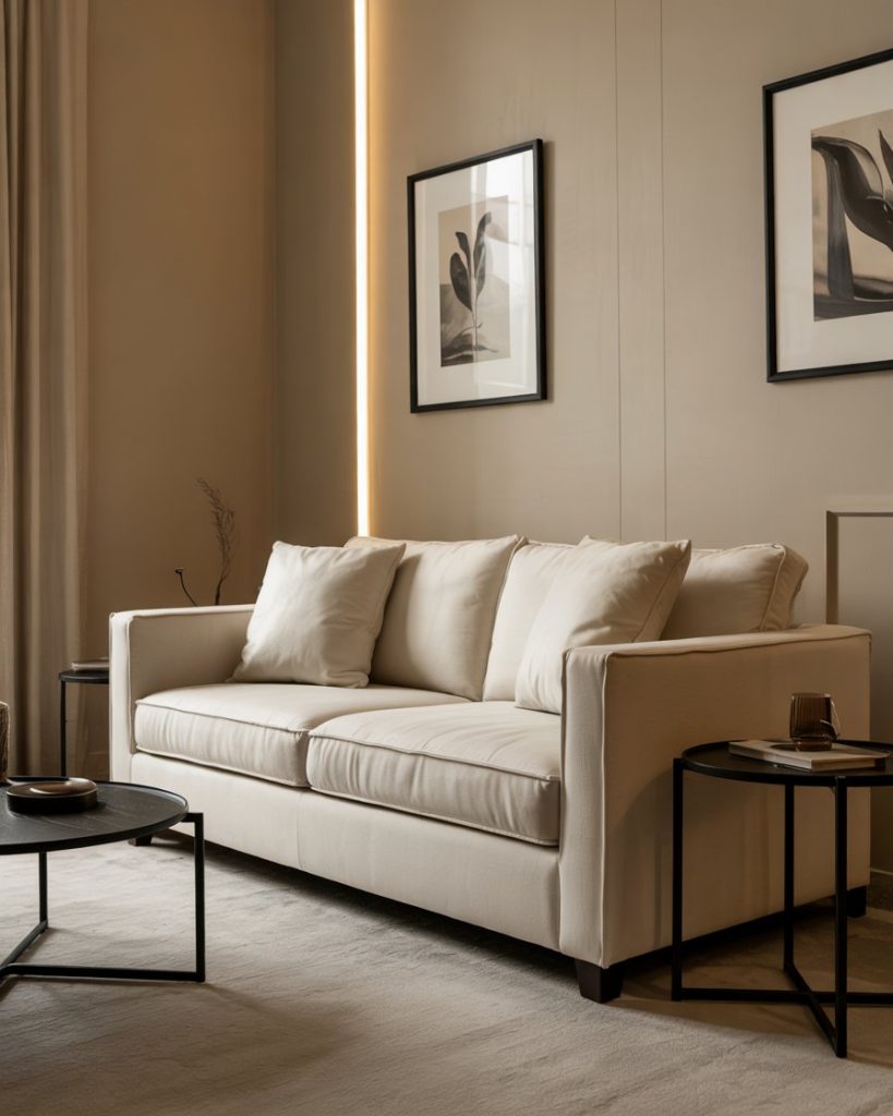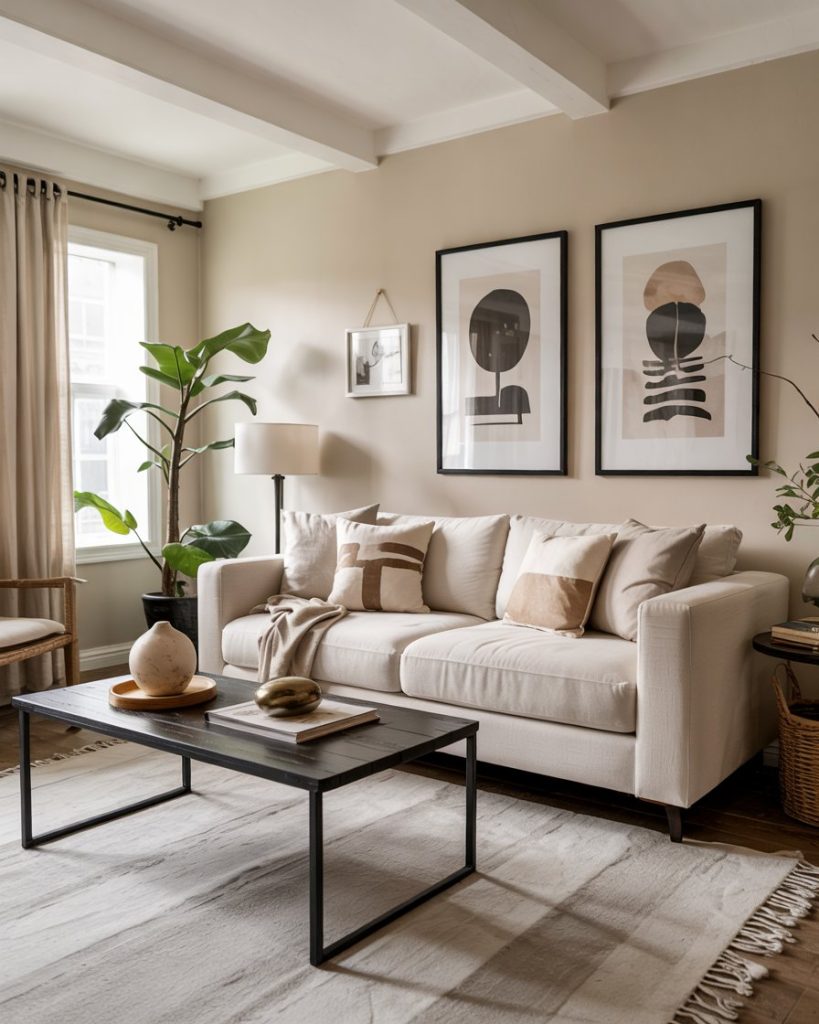 Black accents Decor colors contrast perfectly with soft beige furniture, achieving a modern-meets-classic tone. Interior stylists from Architectural Digest suggest mixing creamy upholstery with dark wood or black metal shelving to balance airiness and definition. A black-framed mirror or table lamp can transform the space into something artful without feeling harsh. This pairing is timeless and adaptable and suits both compact apartments and grand family rooms.
