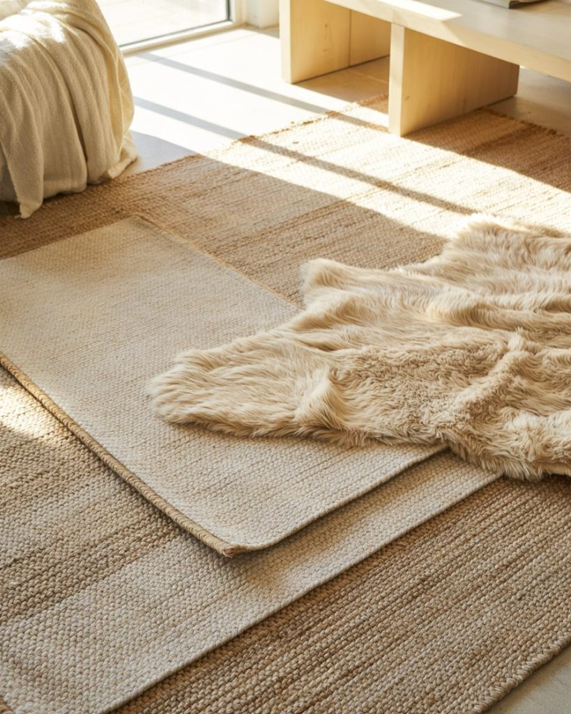 Rug Cozy Add color Decor tricks the eye into seeing zones in open layouts. A chunky wool rug over a flat jute base adds depth while staying neutral. Choose off-white, camel, or faded terracotta threads so crumbs and pet hair stay invisible longer—real life matters. The rug becomes the silent anchor of the room.