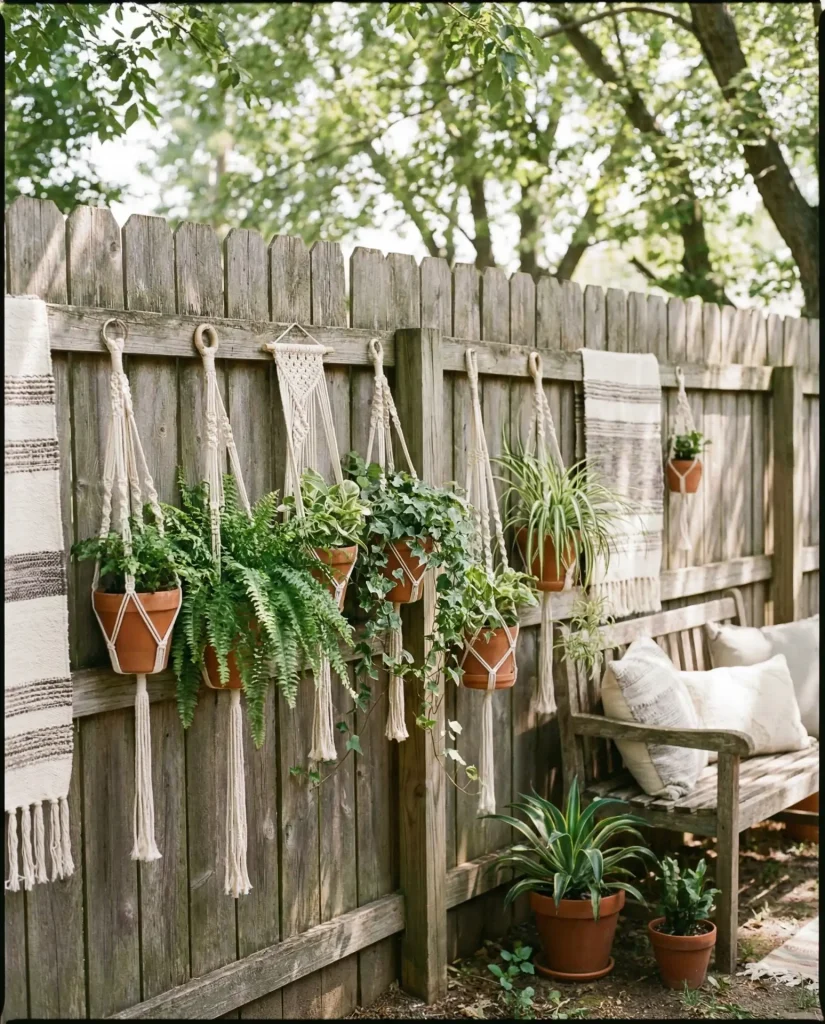 Line a wooden fence with hanging macramé planters filled with trailing plants like pothos, string of pearls, or ivy. The woven holders add texture and soften the hard lines of a standard fence, creating a vertical garden that doesn’t take up ground space. This approach works in narrow yards or along property lines where privacy and beauty intersect. The bohemian vibe pairs well with natural wood tones and casual seating areas, and the plants help filter noise and dust from neighboring properties.