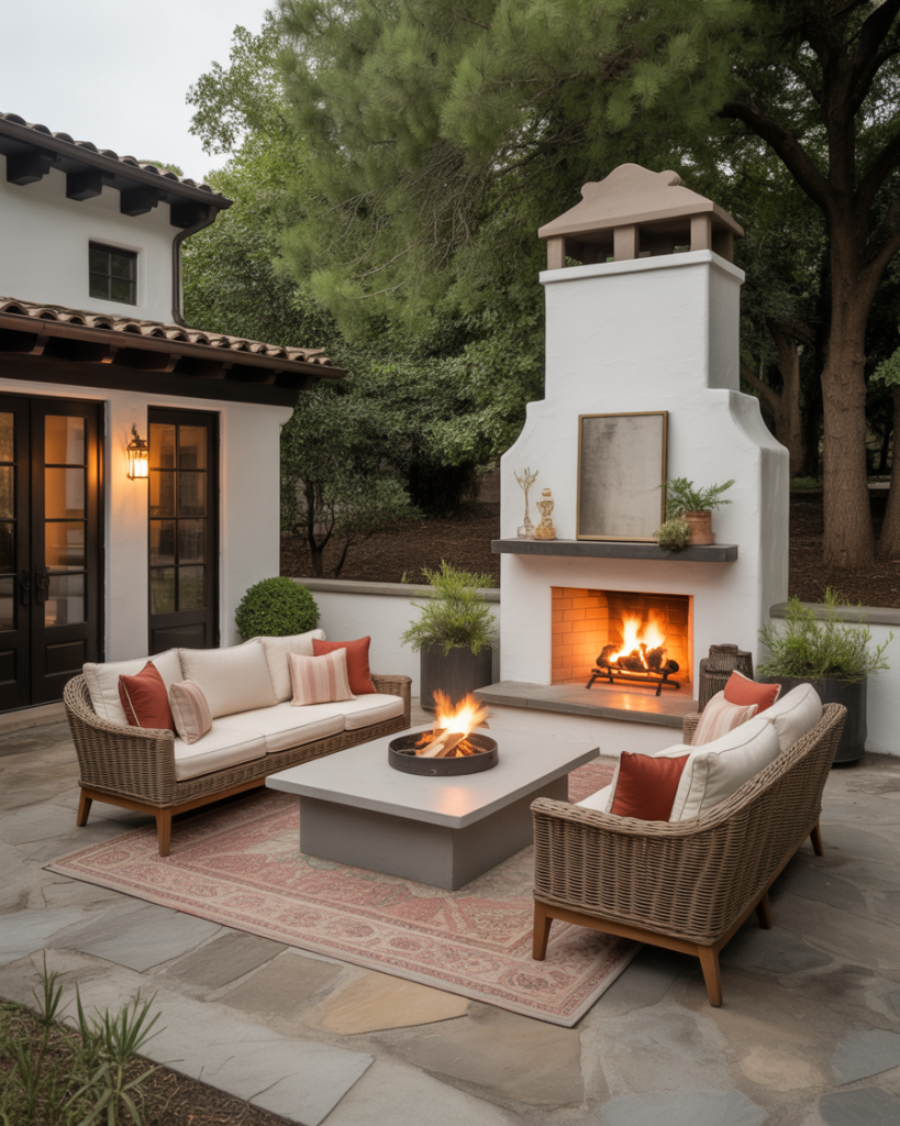 A built-in fireplace transforms patios into year-round retreats. Unlike a portable fire pit, fireplaces anchor the design and feel more permanent. In large backyards, they become a dramatic centerpiece, while even small spaces gain a sense of intimacy and warmth. Many Spanish style homes feature outdoor fireplaces for cooking or relaxing, but modern homes can benefit too. It’s an investment, but one that enhances both comfort and value.