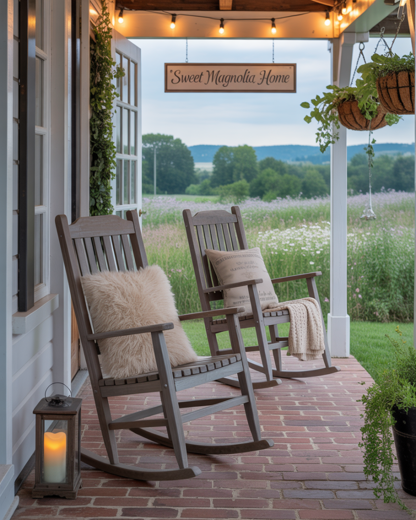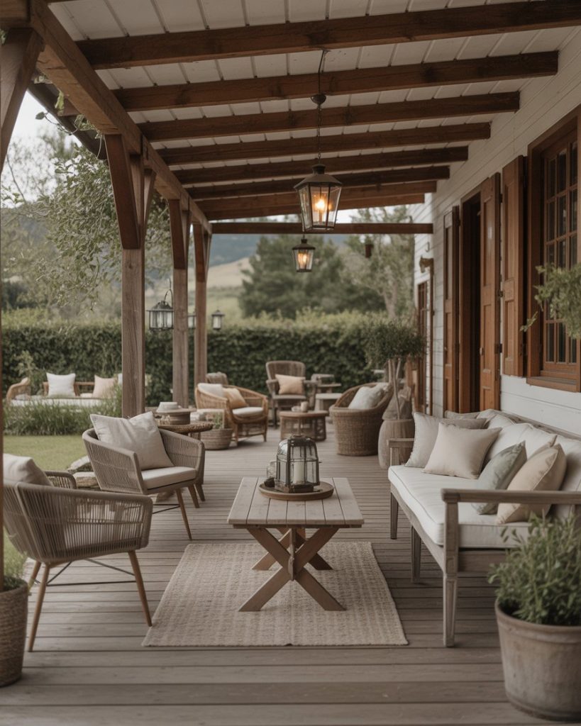 For those who love country living, patios that resemble wide porches create a welcoming, open-air feeling. Using rocking chairs, woven rugs, and rustic lanterns instantly sets a cozy tone. Even in small spaces, porch-style patios work beautifully by adding wooden accents and neutral colors. Decorating with plants in galvanized buckets or mason jar lighting enhances the nostalgic farmhouse look while staying within a budget.