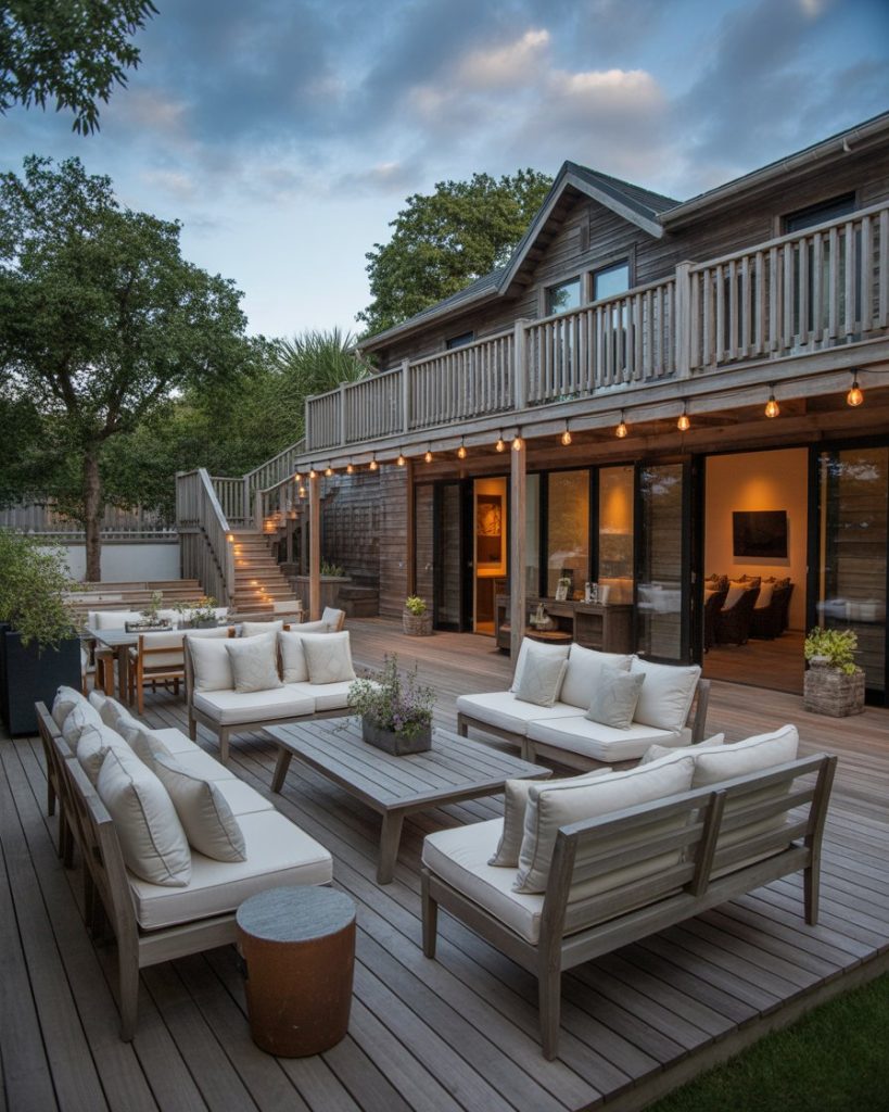 If you have a large patio or expansive deck, the focus should be on entertaining. A combination of multiple seating zones, a dining table, and accent lighting ensures flexibility. Influencers often highlight how kitchen stations and built-in bars enhance the vibe, making gatherings seamless. Rustic wood or Spanish style stone surfaces add texture. With the right decorating, even a vast space feels intimate and cozy when properly divided into zones.