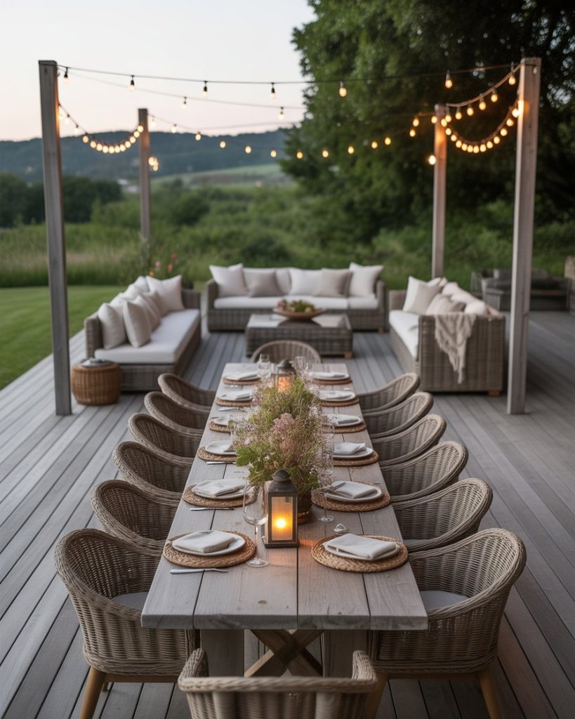 If your heart leans toward rustic charm, patios styled with weathered wood, stone, and vintage décor create a cozy vibe perfect for country living. Even on a budget, flea market finds can give personality to your space, making it feel timeless. Designers like Emily Henderson highlight that adding lanterns, woven rugs, and antique furniture turns deck or backyards into warm, nostalgic escapes.