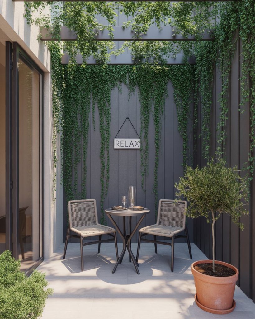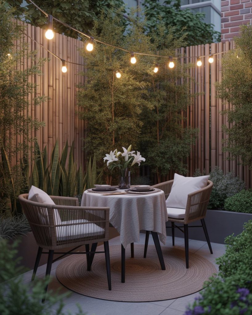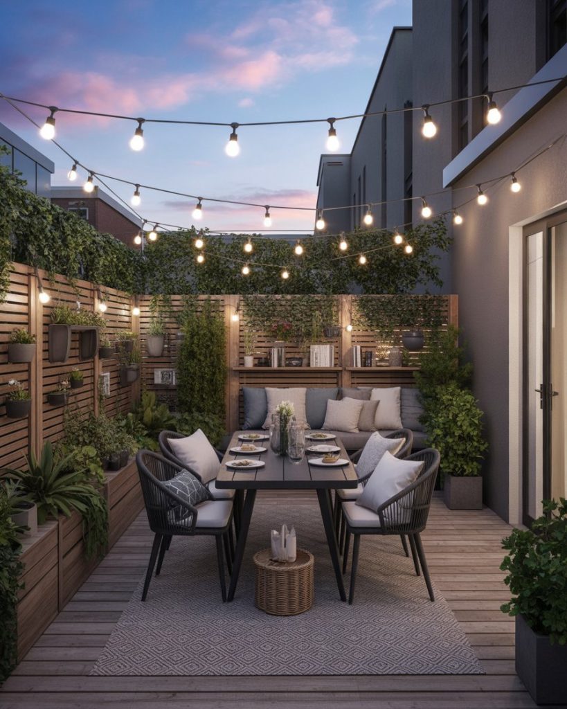 Combining dining setups with privacy panels creates an intimate experience perfect for apartment patios or narrow backyards. A wooden screen or lattice wall not only provides seclusion but also acts as a backdrop for decorating with plants or lights. Designers often suggest keeping it simple—a table, chairs, and candles can make even small spaces feel like a restaurant patio. It’s a modern way to dine outdoors while staying private.