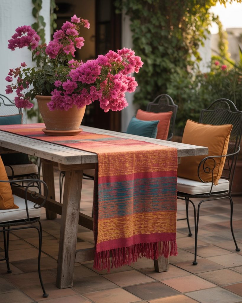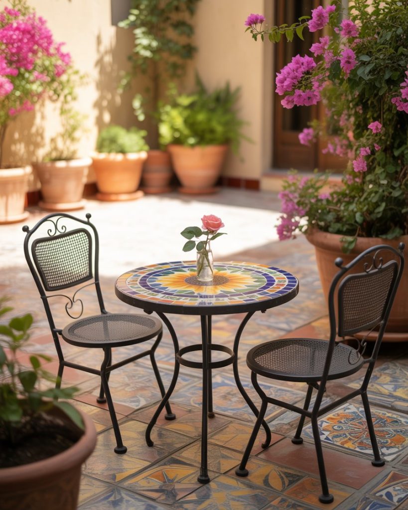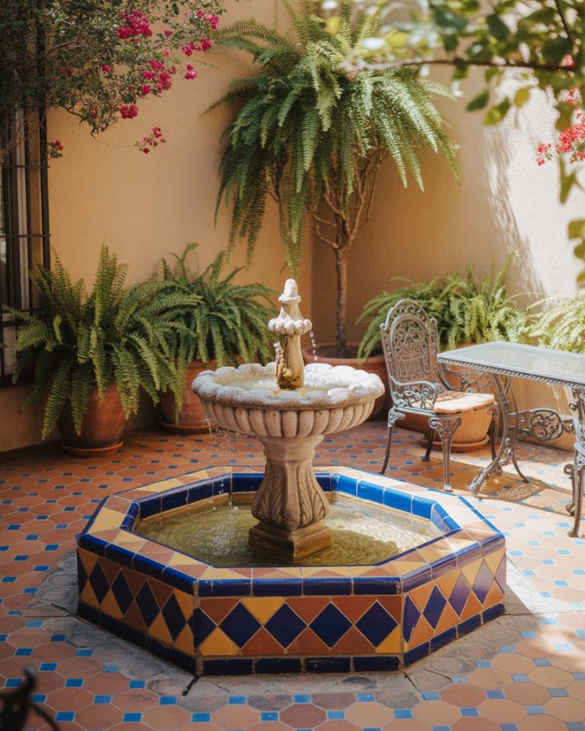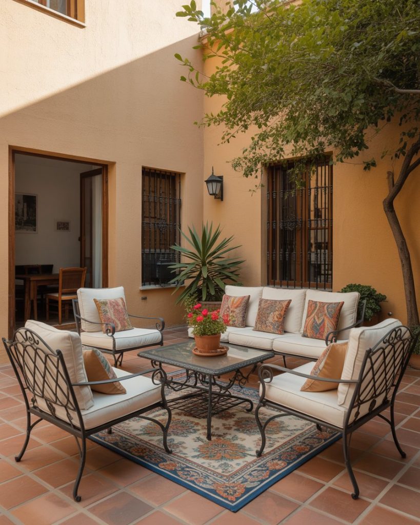 Channeling Spanish style, courtyard patios focus on bright tiles, earthy tones, and wrought-iron details. This design feels natural in large homes but adapts to small spaces too, using patterned cushions or terracotta pots. The mix of bold colors and rustic charm makes it stand out, while still being practical for a budget. Influencers like Justina Blakeney often showcase how Mediterranean textures and textiles transform even tiny patios into vibrant escapes.