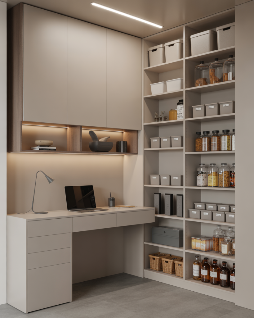 Remote work made the office pantry combo popular—especially in small spaces. One wall stores snacks and dinner prep; the other holds a laptop and planner. It’s not glamorous, but it’s real life for parents, freelancers, and anyone with limited square footage. The trick is blending containers, tech storage, and food zones so it feels intentional, not random.