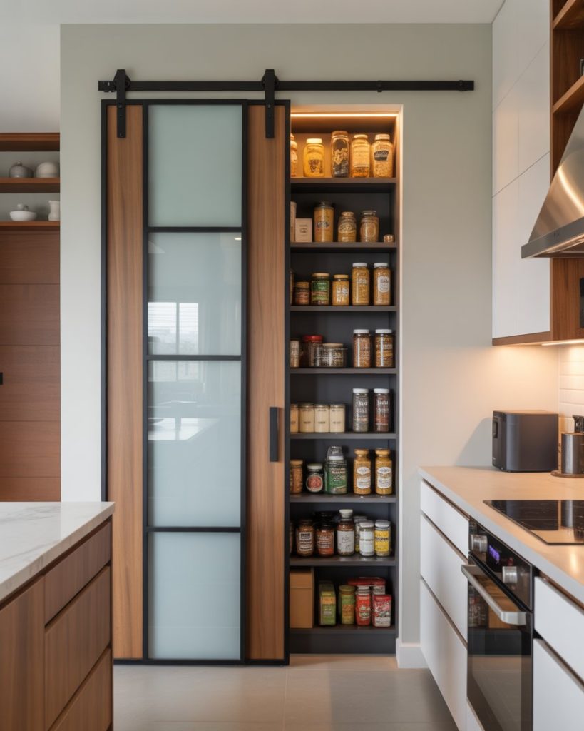 A pantry with a barn-style sliding door blends into an open kitchen layout without taking up swing space. Homeowners love it because it adds character while keeping food storage close by but not visually messy. The door itself becomes design—wood for rustic fans, glass for modern lovers, and even chalkboard paint for families with kids who like to doodle grocery lists.
