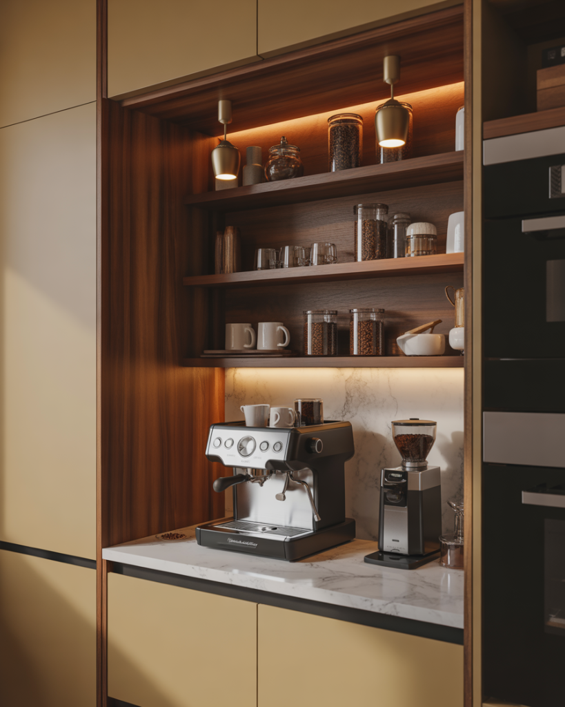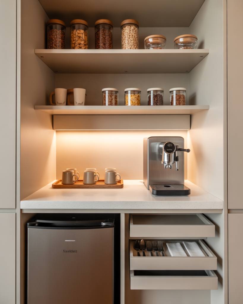 A walk-in pantry that hides a full coffee zone has become a favorite among remote workers and caffeine lovers. Mug hooks, a built-in grinder, a mini fridge for creamers—everything off the main counter. It’s a tiny café inside your home, and yes, people brag about it on Instagram because it feels like getting barista treatment without leaving pajamas.