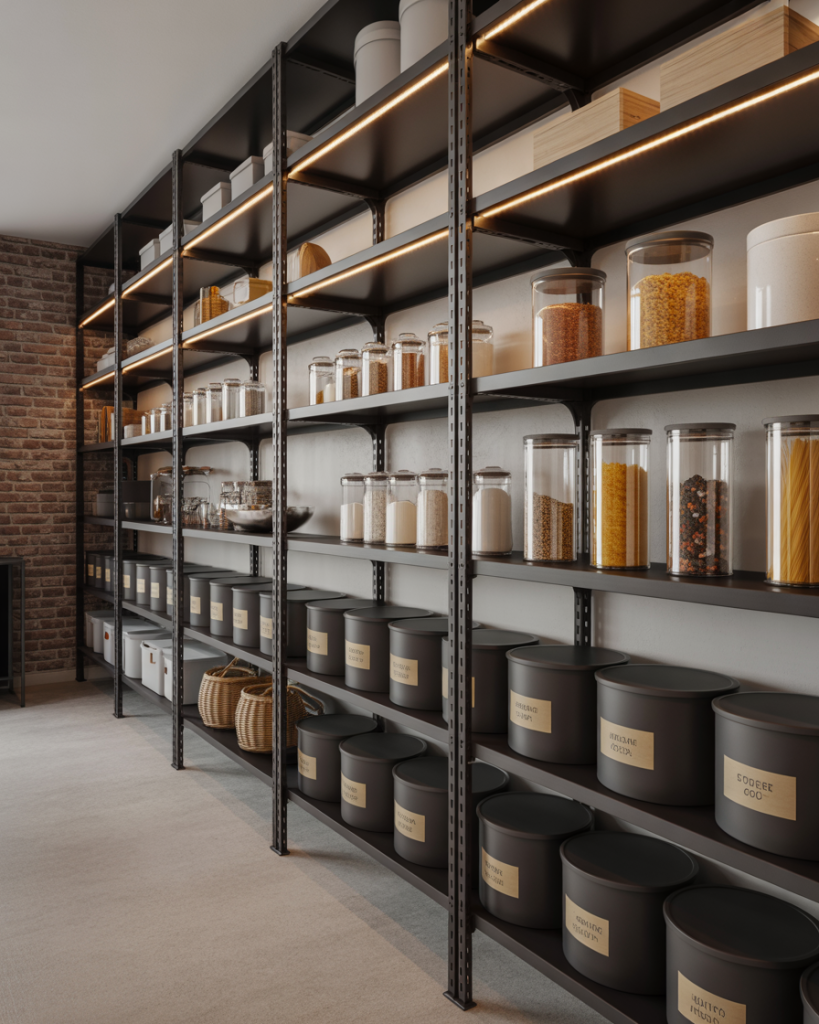 Some people skip built-ins and install steel racks like restaurant kitchens. This gives a large storage feel without custom carpentry, and it’s perfect for bulk shoppers or Costco fans. The industrial look pairs well with lofts or modern farmhouses, and the open setup also forces you to stay organized—because nothing is hidden behind a door.