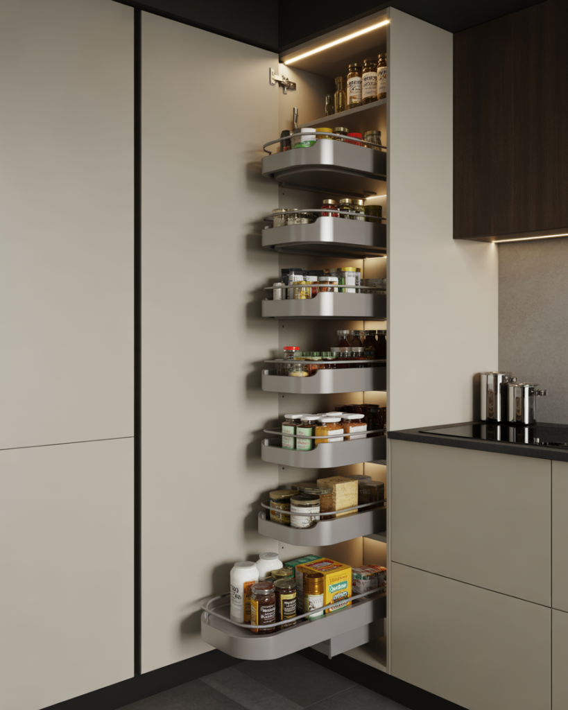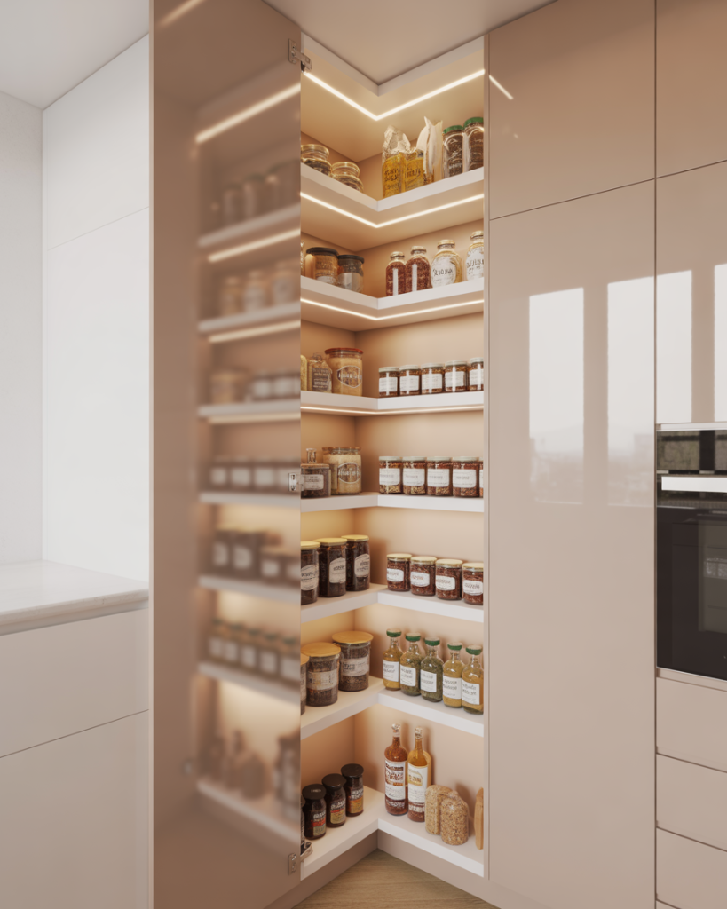 A corner kitchen cabinet can turn into a pull-out tower pantry that rotates or slides, making odd angles useful. This idea works especially well in small kitchens where every inch matters. Instead of deep, blind cabinets, the system brings food to you—no more crawling on the floor looking for the last can of tomatoes.
